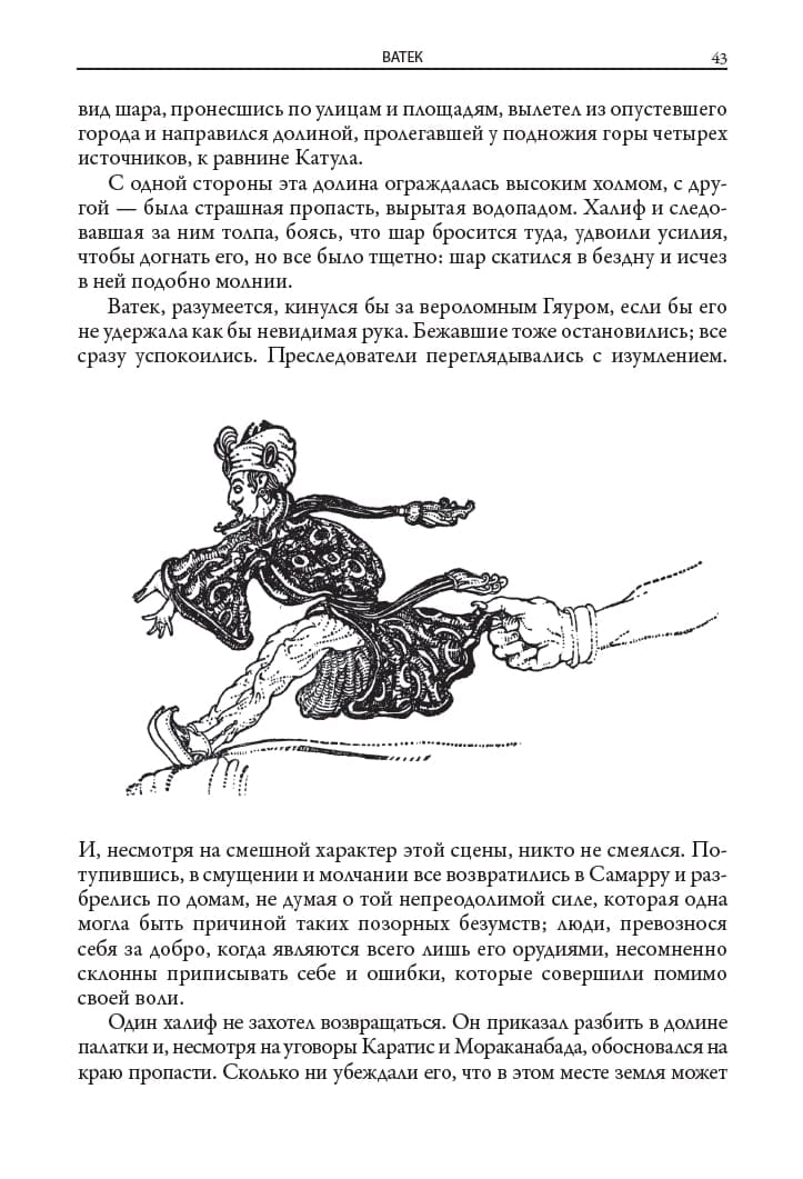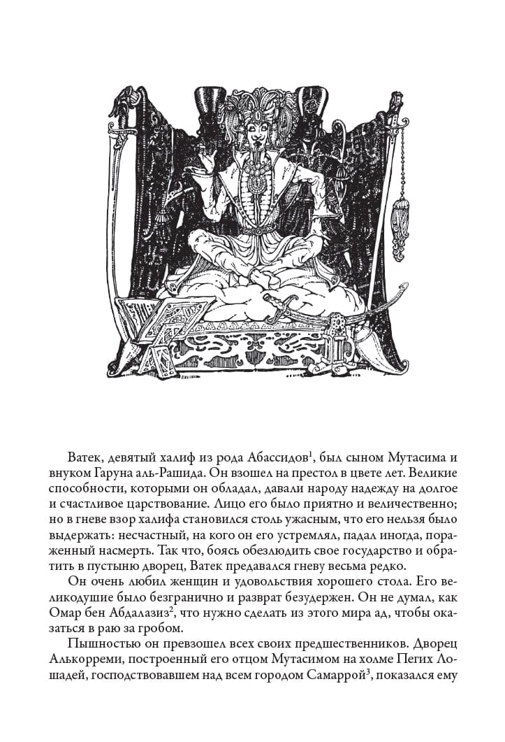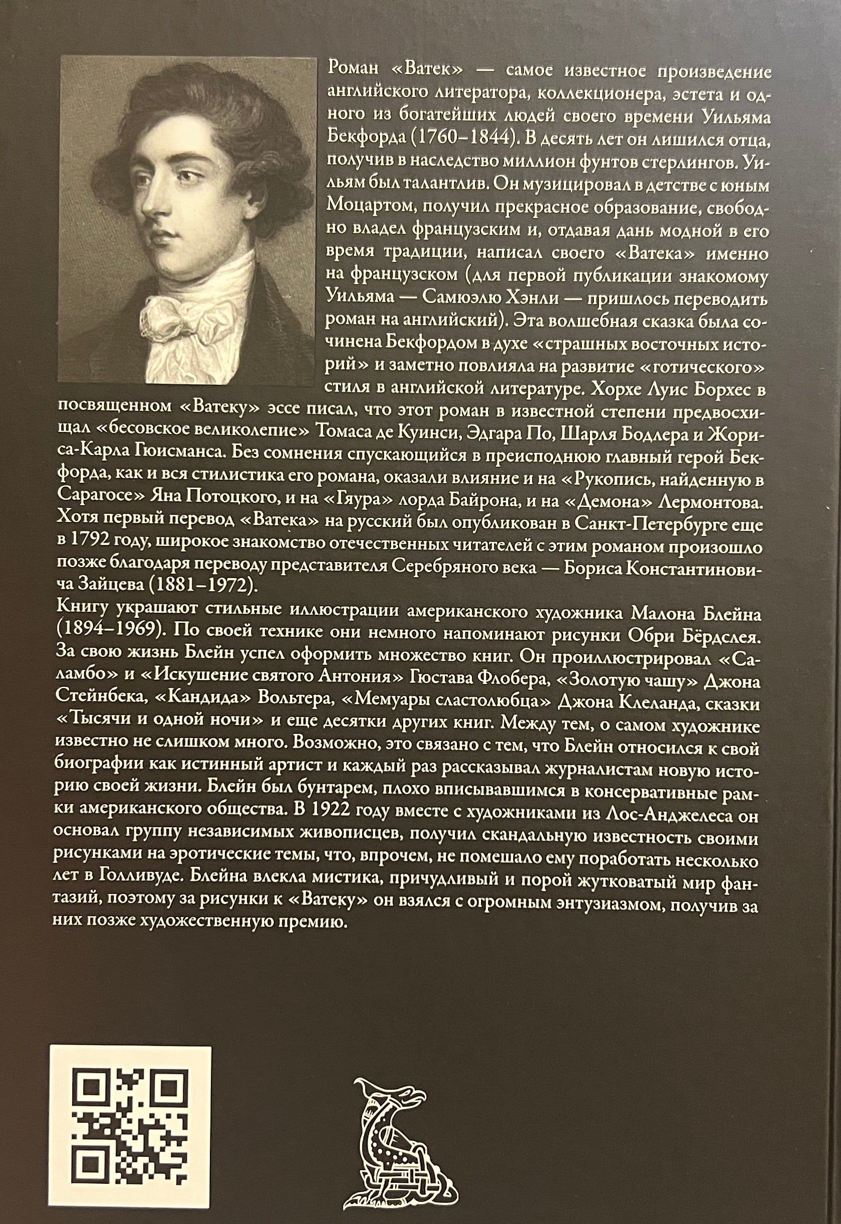 Написанная в «готическом» стиле фантастическая повесть «Ватек» была впервые опубликована в 1786 году. Ее автор, англичанин Уильям Бекфорд (1760–1844), сочинил оригинальную вариацию на тему «Фауста» Гёте, изложив ее в виде арабской сказки. Текст дан в переводе одного из последних крупных представителей Серебряного века — Бориса Константиновича Зайцева (1881–1972). Книгу украшают стильные иллюстрации американского художника Малона Блейна (1894–1969), которые по своей стилистике немного напоминают рисунки Обри Бёрдслея.
