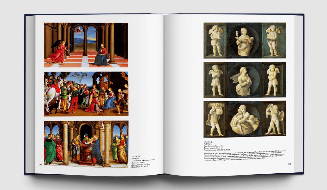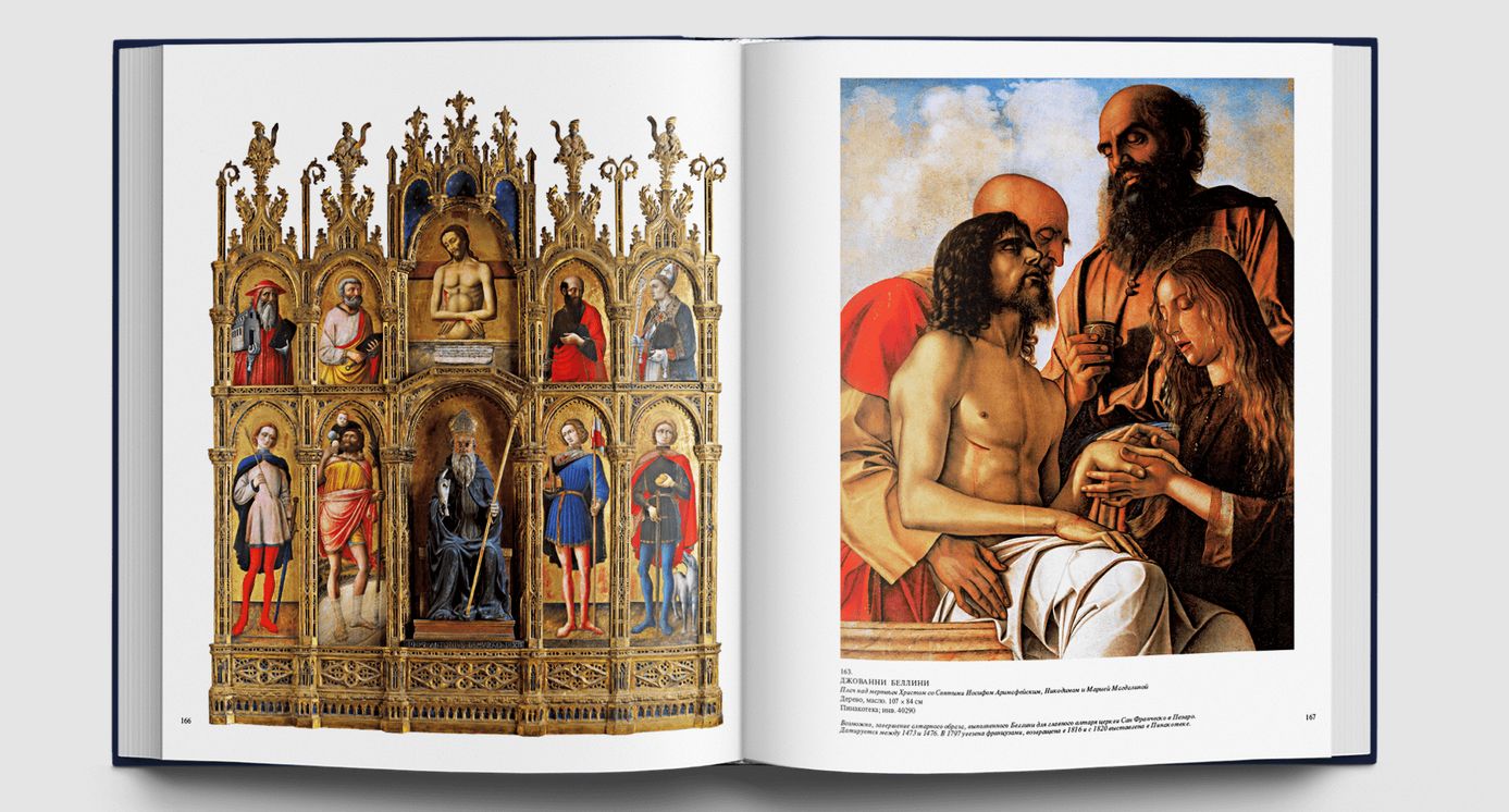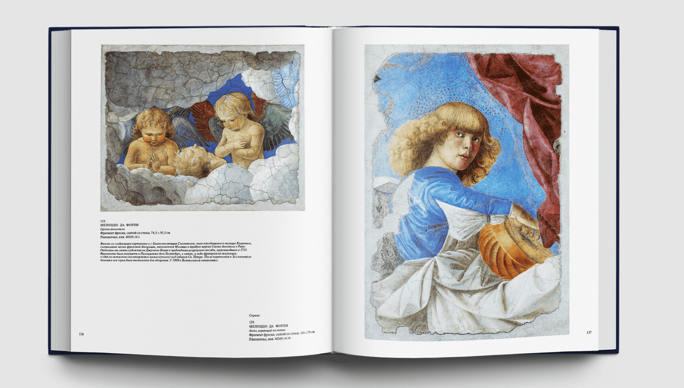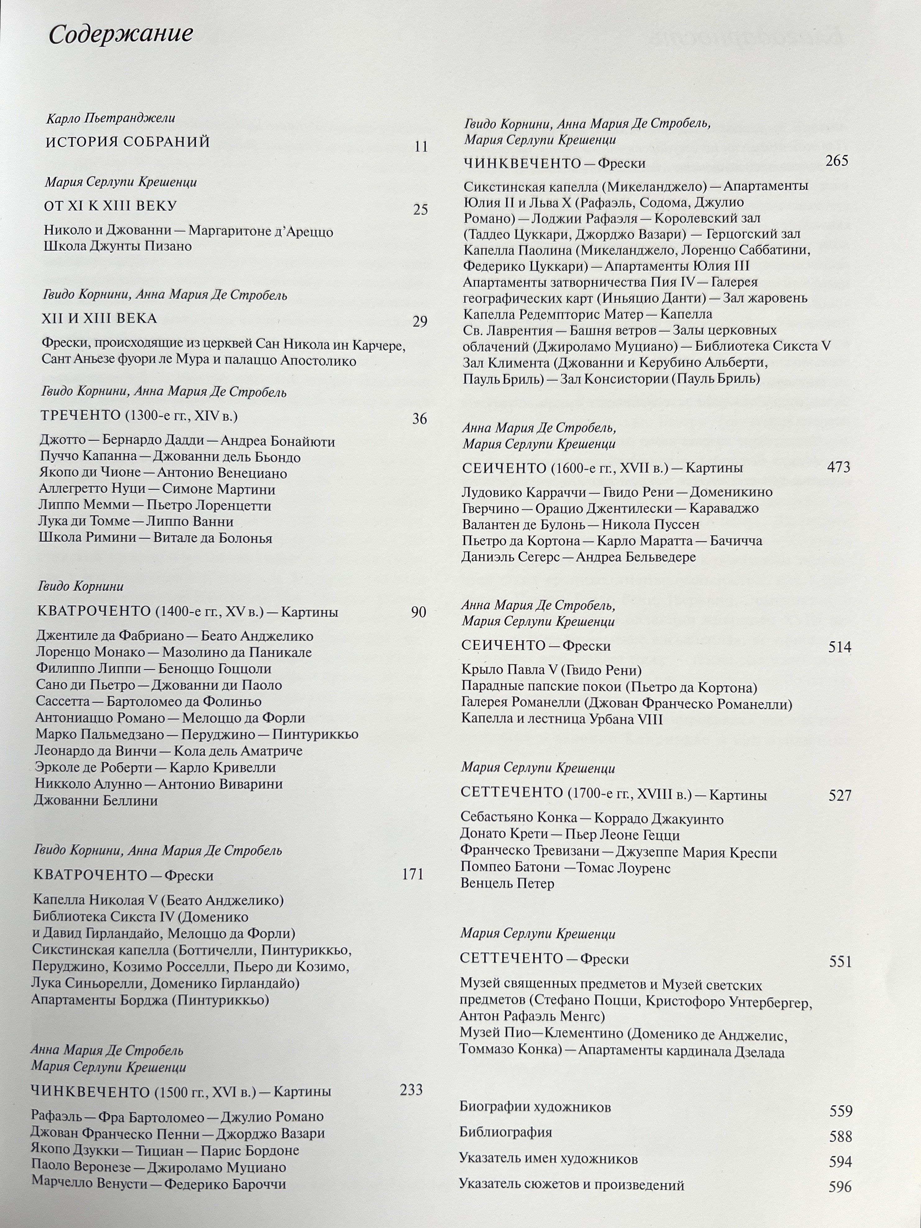 Станковые картины, алтарные образы, драгоценные пределлы привозили сюда из многих городов Италии просто как замечательные создания искусства, без какой бы то ни было организующей идеи. Папа Пий IV повелел собрать разрозненные произведения живописи из папских дворцов, заложив тем самым основу систематизированной музейной коллекции. Шедевры Ватикана всегда будут вызывать наше восхищение, ведь среди них — большой «Триптих» Джотто, очаровательные «Музицирующие ангелы» Мелоццо да Форли, редчайшая пределла с «Чудесами Святого Винченцо Феррера» кисти Эрколе де Роберти, «Мадонна ди Фолиньо», «Коронование Марии» и «Преображение» Рафаэля, «Святой Иероним» Леонардо да Винчи, скорбный «Плач над мертвым Христом» Джованни Беллини, «Алтарный образ» Тициана из церкви Сан Николо деи Фрари, «Снятие с креста» Караваджо, «Мученичество Святого Эразма» Пуссена и известнейшие работы Гверчино и Гвидо Рени. Картины и фрески, собранные в Ватикане, позволяют познакомиться с историей живописи от Средневековья до XVIII века и соприкоснуться с высочайшими вершинами искусства. Многие из этих произведений ранее никогда не воспроизводились в наших изданиях