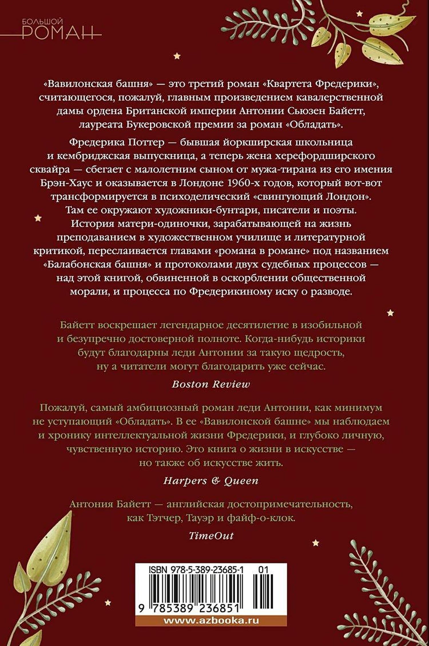 «Вавилонская башня» — это третий роман «Квартета Фредерики», считающегося, пожалуй, главным произведением кавалерственной дамы ордена Британской империи Антонии Сьюзен Байетт. Тетралогия писалась в течение четверти века, и сюжет ее также имеет четвертьвековой охват, причем первые два романа («Дама в саду», «Живая вещь») вышли еще до удостоенного Букеровской премии международного бестселлера «Обладать», а третий и четвертый — после. Итак, Фредерика Поттер — бывшая йоркширская школьница и кембриджская выпускница, а теперь жена херефордширского сквайра — сбегает с малолетним сыном от мужа-тирана из его имения Брэн-Хаус и оказывается в Лондоне 1960-х годов, который вот-вот трансформируется в психоделический «свингующий Лондон». Там ее окружают художники-бунтари, писатели и поэты. История матери-одиночки, зарабатывающей на жизнь преподаванием в художественном училище и литературной критикой, переслаивается главами «романа в романе» под названием «Балабонская башня» и протоколами двух судебных процессов — над этой книгой, обвиненной в оскорблении общественной морали, и по Фредерикиному иску о разводе. «Байетт воскрешает легендарное десятилетие в изобильной и безупречно достоверной полноте. Когда-нибудь историки будут благодарны леди Антонии за такую щедрость, ну а читатели могут благодарить уже сейчас» (Boston Review).