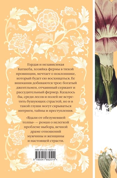 «Вдали от обезумевшей толпы» — история независимой хозяйки фермы, внимания которой добиваются трое: богатый джентльмен, отчаянный сержант и рассудительный фермер. Нелегкая проблема выбора, вечная драма отношений мужчины и женщины, интриги, тайны и настоящая страсть в романе, ставшем первым литературным успехом автора. Гарди удивительным образом затронул струны души читателей трех столетий. Его роман по-прежнему считается скандальным и нарушающим основы основ уже нынешнего общества.
