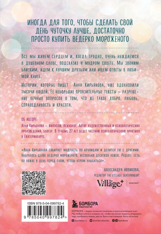 Иногда, чтобы сделать свой день чуточку лучше, достаточно просто купить ведерко мороженого. Все мы живем сердцем и, когда трудно, очень нуждаемся в душевном слове, подсказке и мудром совете. Мы звоним близким, идем к лучшим друзьям или ищем ответы в любимой книге. Истории, которые пишет Анна Кирьянова, уже вдохновили тысячи людей. Ее небольшие пронзительные тексты – разрешение вечных вопросов о том, что же такое добро, любовь, справедливость и красота.
