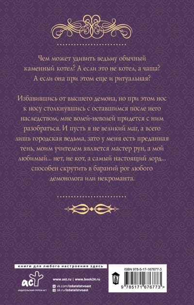 Чем может удивить ведьму обычный каменный котел? А если это не котел, а чаша? А если она при этом еще и ритуальная? Избавившись от высшего демона, но при этом нос к носу столкнувшись с оставшимся после него наследством, мне волей-неволей придется с ним разобраться. И пусть я — не великий маг, а всего лишь городская ведьма, зато у меня есть преданная тень, моим учителем является мастер рун, а мой любимый… нет, не кот, а самый настоящий лорд… способен скрутить в бараний рог любого демонолога или некроманта.