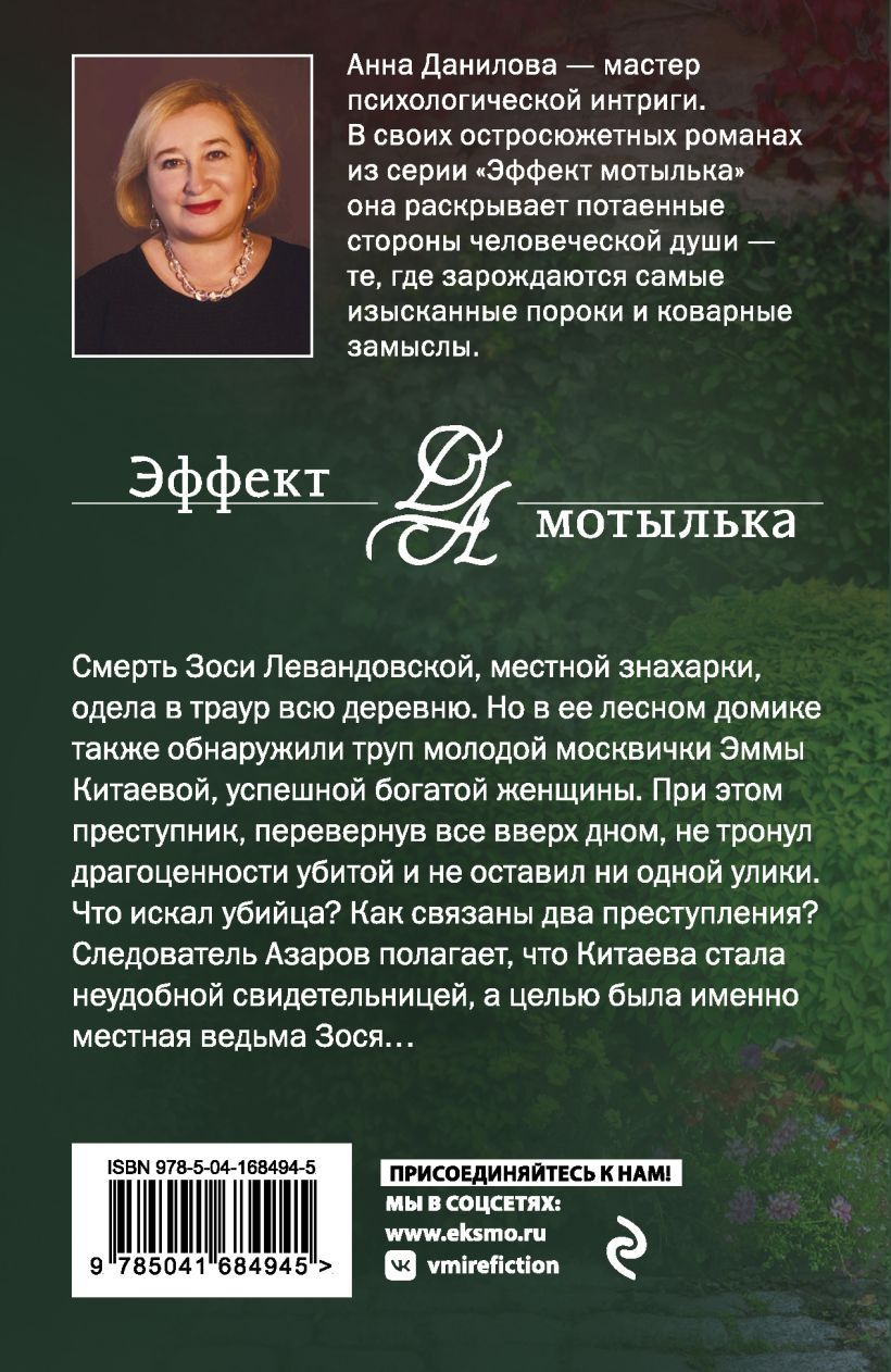 Смерть Зоси Левандовской, местной знахарки, одела в траур всю деревню. Жители судачили, строили свои версии, поминали Зосю. В ее лесном домике также обнаружили труп молодой москвички Эммы Китаевой, успешной богатой женщины, владелицы кафе. Приехала к гадалке и нашла свою гибель… Преступник не оставил в доме ни одной улики, хотя все было перевернуто вверх дном. Что искал убийца? Ведь в доме и красть было нечего. К тому же все драгоценности Китаевой были на месте… Мотив убийства Левандовской и Китаевой пока не просматривается. И следователь Азаров все больше склонен полагать, что Китаеву зарезали как свидетельницу преступления — целью была именно местная ведьма Зося… Анна Данилова — профессиональный писатель, работает в разных жанрах (сюрреализм, реалистическая проза, детские повести, драматургия), на ее счету несколько пьес, сценариев. Но большая часть произведений написана в жанре психологического детектива. Книги автора были изданы во многих российских издательствах, а также переведены на болгарский и турецкие языки и изданы в Софии и Стамбуле.