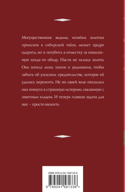 Могущественная ведьма, хозяйка золотых приисков в сибирской тайге, может щедро одарить, но и погубить в отместку за нанесенную когда-то обиду. Настя не искала золота. Она хотела лишь покоя и уединения, чтобы забыть об ужасном предательстве, которое ей удалось пережить. Не по своей воле оказалась она втянута в страшную историю, связанную с заветным кладом. И теперь главная задача для нее — просто выжить.