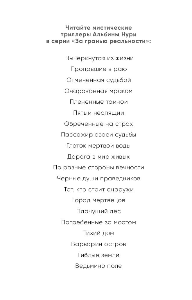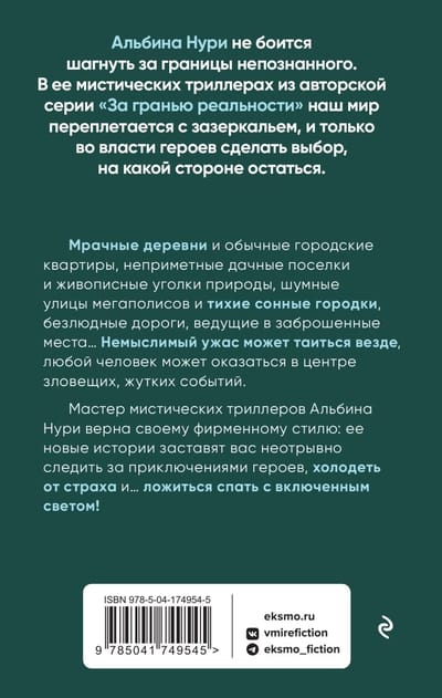 Мрачные деревни и обычные городские квартиры, неприметные дачные поселки и живописные уголки природы, шумные улицы мегаполисов и тихие сонные городки, безлюдные дороги, ведущие в заброшенные места… Немыслимый ужас может таиться везде, любой человек может оказаться в центре зловещих, жутких событий. Мастер мистических триллеров Альбина Нури верна своему фирменному стилю: ее новые истории заставят вас неотрывно следить за приключениями героев, холодеть от страха и… ложиться спать с включенным светом!