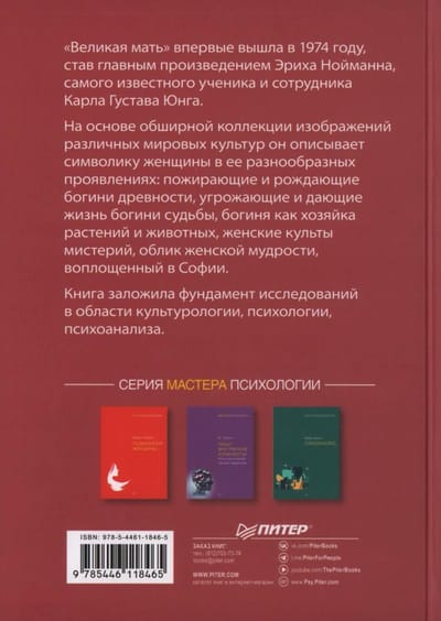 «Великая мать» впервые вышла в 1974 году, став главным произведением Эриха Нойманна, самого известного ученика и сотрудника Карла Густава Юнга. На основе обширной коллекции изображений различных мировых культур он описывает символику женщины в ее разнообразных проявлениях: пожирающие и рождающие богини древности, угрожающие и дающие жизнь богини судьбы, богиню как хозяйку растений и животных, женские культы мистерий, облик женской мудрости, воплощенный в Софии. Книга заложила фундамент исследований в области культурологии, психологии, психоанализа.