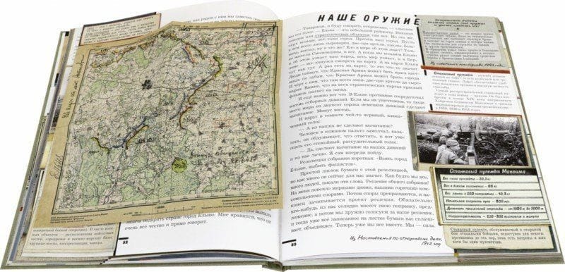 На полях книги, в клапанах и на специальных исторических разворотах размещён подробный историко-бытовой комментарий о ходе войны, устройстве советской армии, военной форме, оружии, орденах и повседневной жизни на фронте, в тылу, в эвакуации, в блокадном Ленинграде. Подлинные предметы и документы тех лет - письма с передовой, газетные очерки, военные плакаты, наградные листы и фотоснимки из семейных архивов - помогут увидеть и понять, какими были эти годы для всех, кого коснулась война.