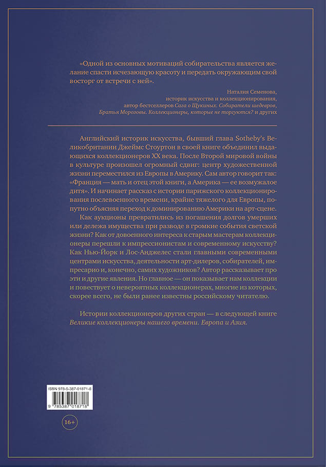 Как аукционы превратились из погашения долгов умерших или дележа имущества при разводе в громкие события светской жизни? Как от довоенного интереса к старым мастерам коллекционеры перешли к импрессионистам и современному искусству? Как Нью-Йорк и Лос-Анджелес стали главными современными центрами искусства, деятельности арт-дилеров, собирателей, импресарио и, конечно, самих художников? Также автор рассказывает о том, как предметом собирательства становились любые произведения искусства: от первобытных масок до модернистской живописи и скульптуры, от китайского фарфора до европейского столового серебра, а коллекционерами становились разные люди с разными финансовыми возможностями: и промышленные магнаты, и родовитые аристократы, и известные кутюрье, и простые клерки. Но главное — он показывает нам коллекции и повествует о невероятных коллекционерах, многие из которых, скорее всего, не были ранее известны российскому читателю.