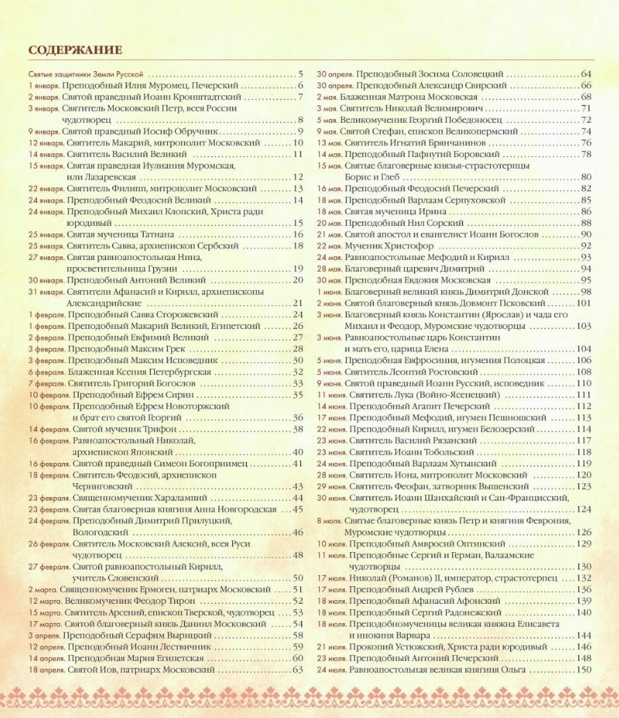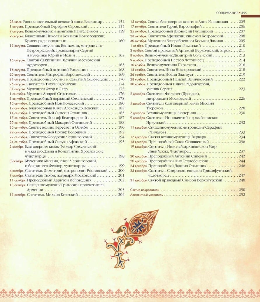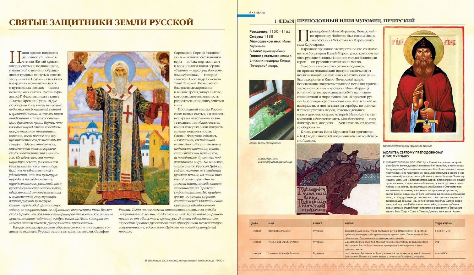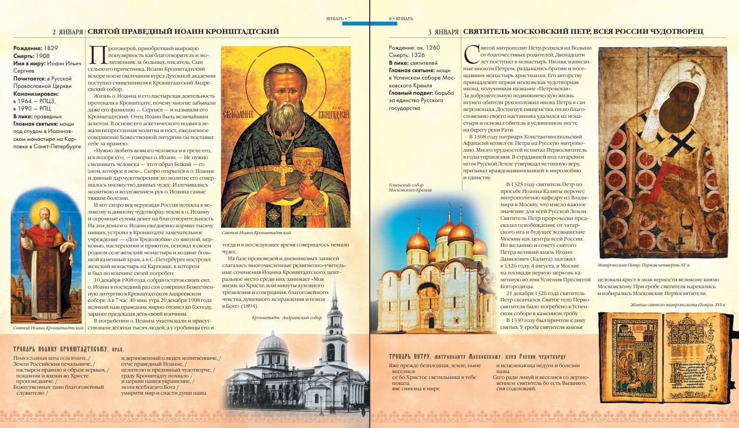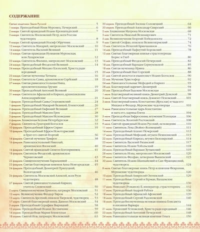В издание вошли статьи о многих известных по всей России святых, таких как святой праведный Иоанн Кронштадтский, блаженная Ксения Петербургская, блаженная Матрона Московская, великомученик Георгий Победоносец, святые благоверные князья-страстотерпцы Борис и Глеб.