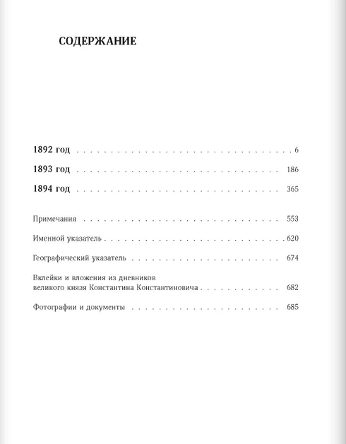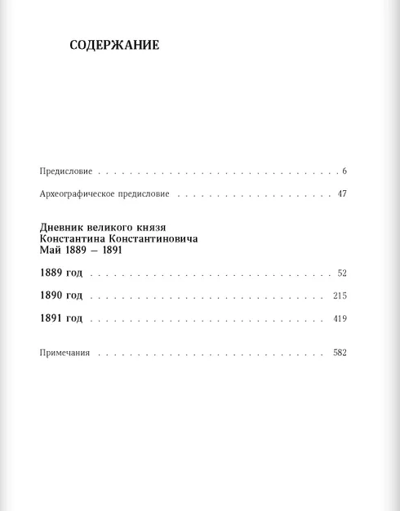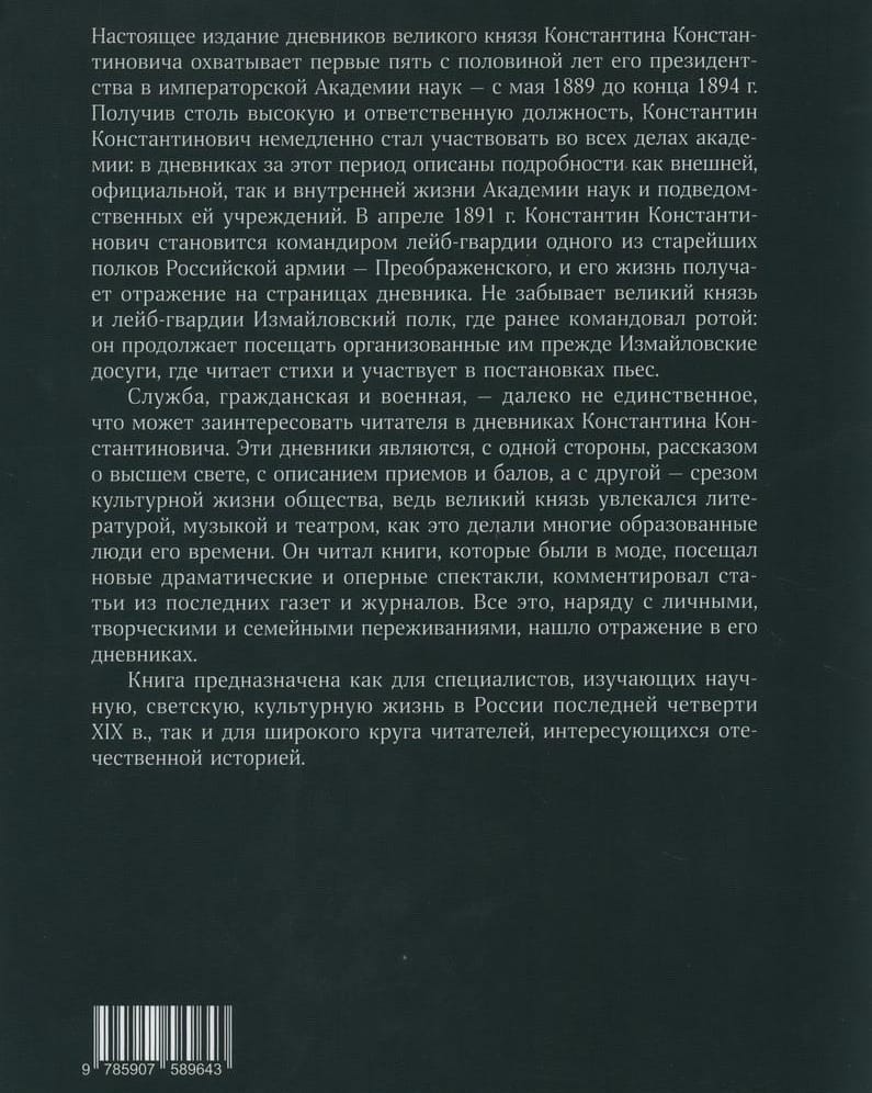 Настоящее издание дневников великого князя Константина Константиновича охватывает первые пять с половиной лет его президентства в Императорской Академии наук — с мая 1889 до конца 1894 г. Получив столь высокую и ответственную должность, Константин Константинович немедленно стал участвовать во всех делах Академии наук: в дневниках за этот период описаны подробности как внешней, официальной, так и внутренней жизни Академии наук и подведомственных ей учреждений. В апреле 1891 г. Константин Константинович становится командиром лейб-гвардии Преображенского полка, и в его дневниках получает отражение полковая жизнь этого одного из старейших полков Российской армии. Не забывает великий князь и лейб-гвардии Измайловский полк, где ранее командовал ротой: он продолжает посещать организованные им прежде Измайловские досуги, где читает стихи и участвует в постановках пьес.