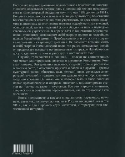 Служба, гражданская и военная, далеко не единственное, что может заинтересовать читателя в дневниках Константина Константиновича. Эти дневники являются, с одной стороны, рассказом о высшем свете, с описанием приемов и балов, а с другой — срезом культурной жизни общества, ведь великий князь увлекался литературой, музыкой и театром, как это делали многие образованные люди его времени. Он читал книги, которые были в моде, посещал новые драматические и оперные спектакли, комментировал статьи из последних газет и журналов. Все это, наряду с личными, творческими и семейными переживаниями, нашло отражение в его дневниках. Книга предназначена как для специалистов, изучающих научную, светскую, культурную жизнь в России последней четверти XIX в., так и для широкого круга читателей, интересующихся отечественной историей.