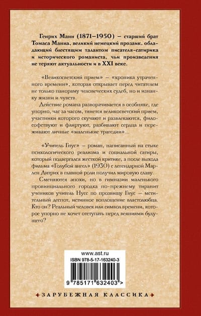 «‎Учитель Гнус»‎ — роман, написанный на стыке психологического реализма и социальной сатиры, который подвергался жесткой критике, а после выхода фильма «‎Голубой ангел»‎ (1930) с легендарной Марлен Дитрих в главной роли получил мировую славу.