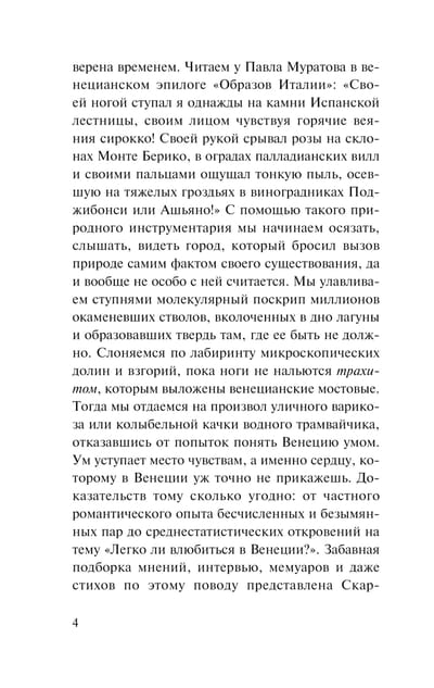 Скарпа раскрывает городские секреты, известные только венецианцам, исконный язык Венеции, необходимый для того, чтобы лучше узнать город. Автор призывает читателя, использовать все органы чувств: осязать, слышать, видеть, чувствовать город, разум должен уступить место чувствам, а именно сердцу, которому в Венеции уж точно не прикажешь.
