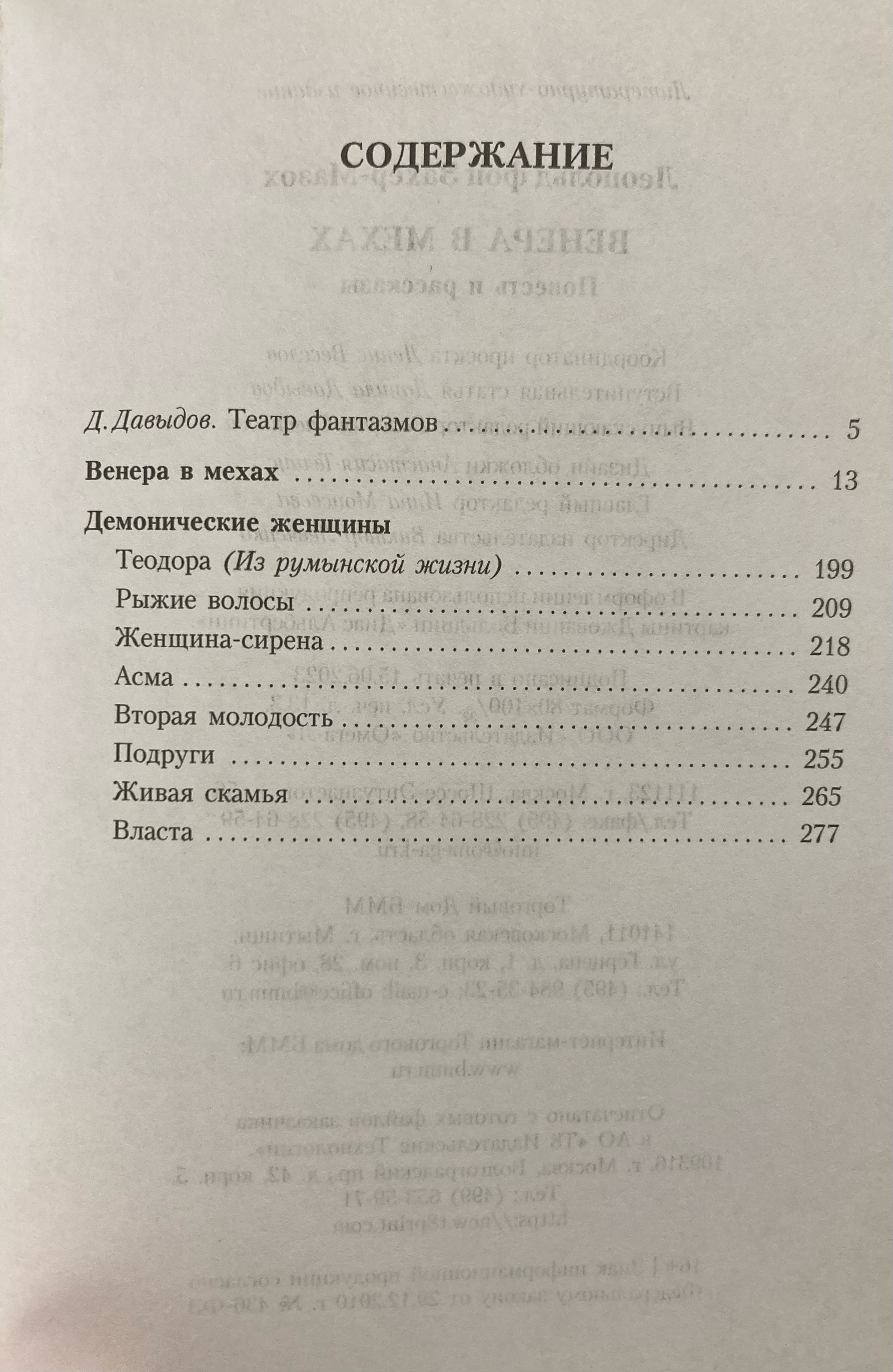 Всемирную известность австрийскому писателю Леопольду фон Захер-Мазоху принесли произведения, где главной темой выступает власть красивой и деспотичной женщины над слабым мужчиной; при этом мужчина получает наслаждение от физического и эмоционального насилия со стороны женщины (мазохизм). В этот сборник вошла самая известная повесть автора - «Венера в мехах» (1870), написанная им после тяжелого разрыва со своей возлюбленной, Фанни фон Пистор; а также рассказы из цикла «Демонические женщины». ...В саду в лунную ночь Северин встречает Венеру - ее зовут Ванда. Богиня предлагает Северину стать ее рабом... Будоражащая история, полная чувственных эмоций, которые «раб» Северин испытывает к своей Госпоже. В роли Госпожи Ванда заставляет героя подписать договор, по которому отныне его жизнь полностью принадлежит ей. Но пока она носит свои меха - Северин счастлив.