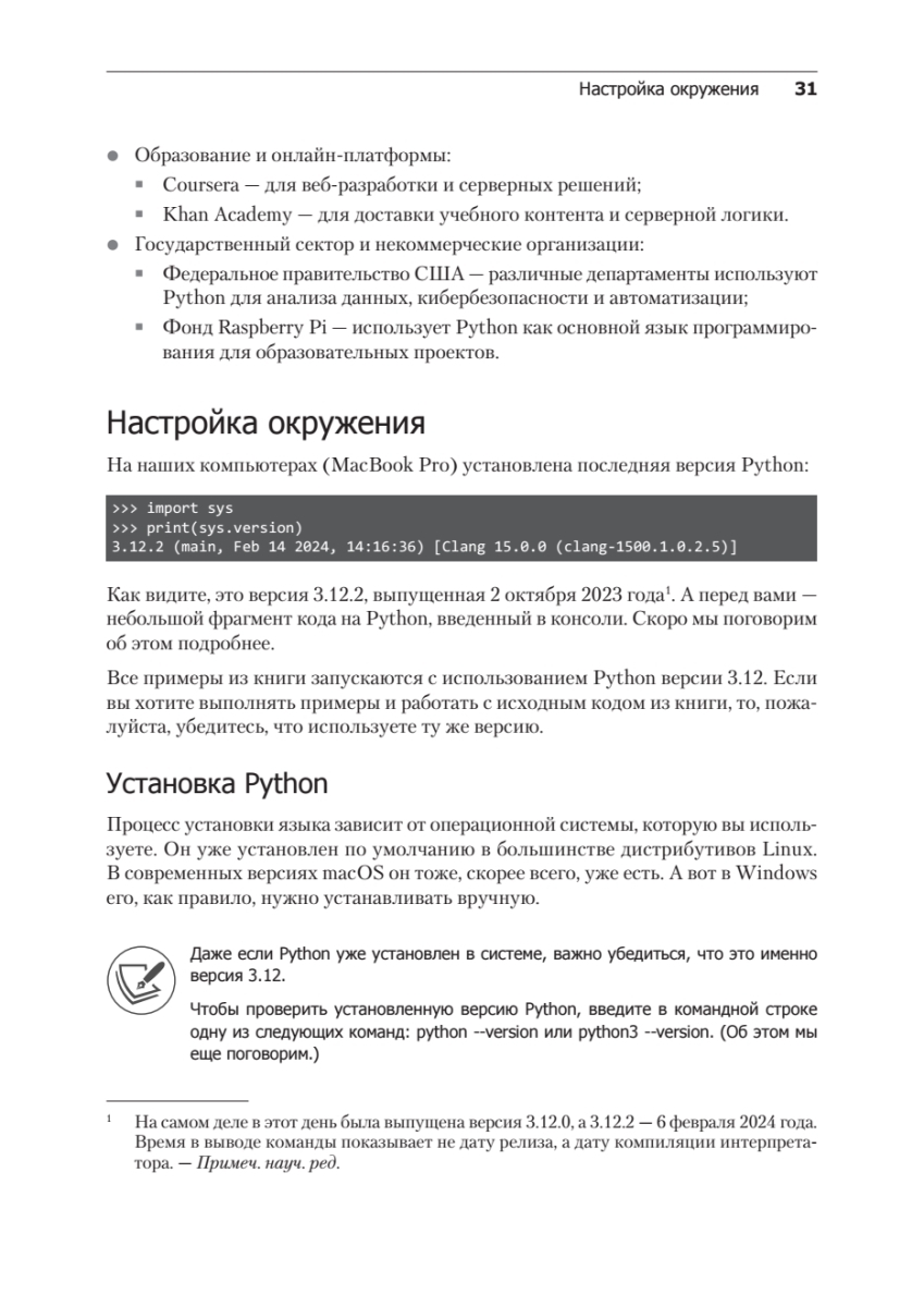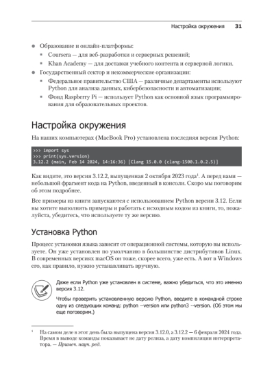 Книга включает описание новейших возможностей, появившихся в версиях Python 3.9–3.12, в том числе главы об аннотациях типов и консольных приложениях, а также примеры, демонстрирующие современные практики веб-разработки на Python.