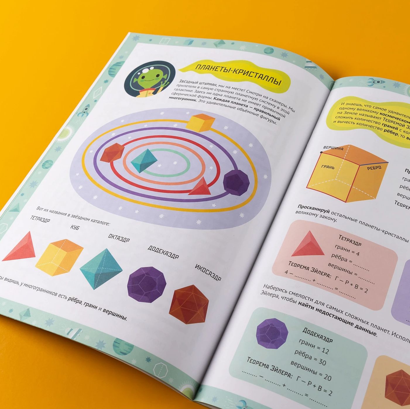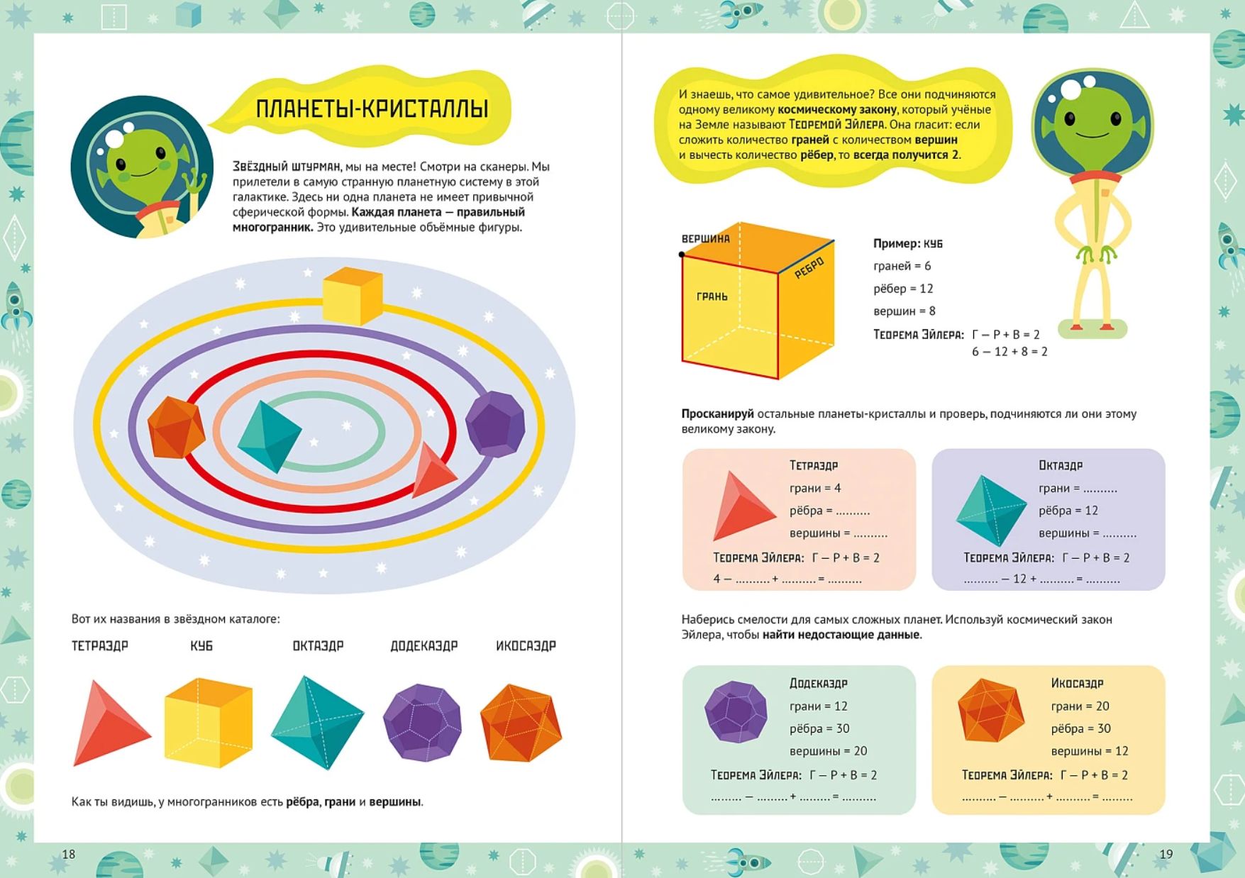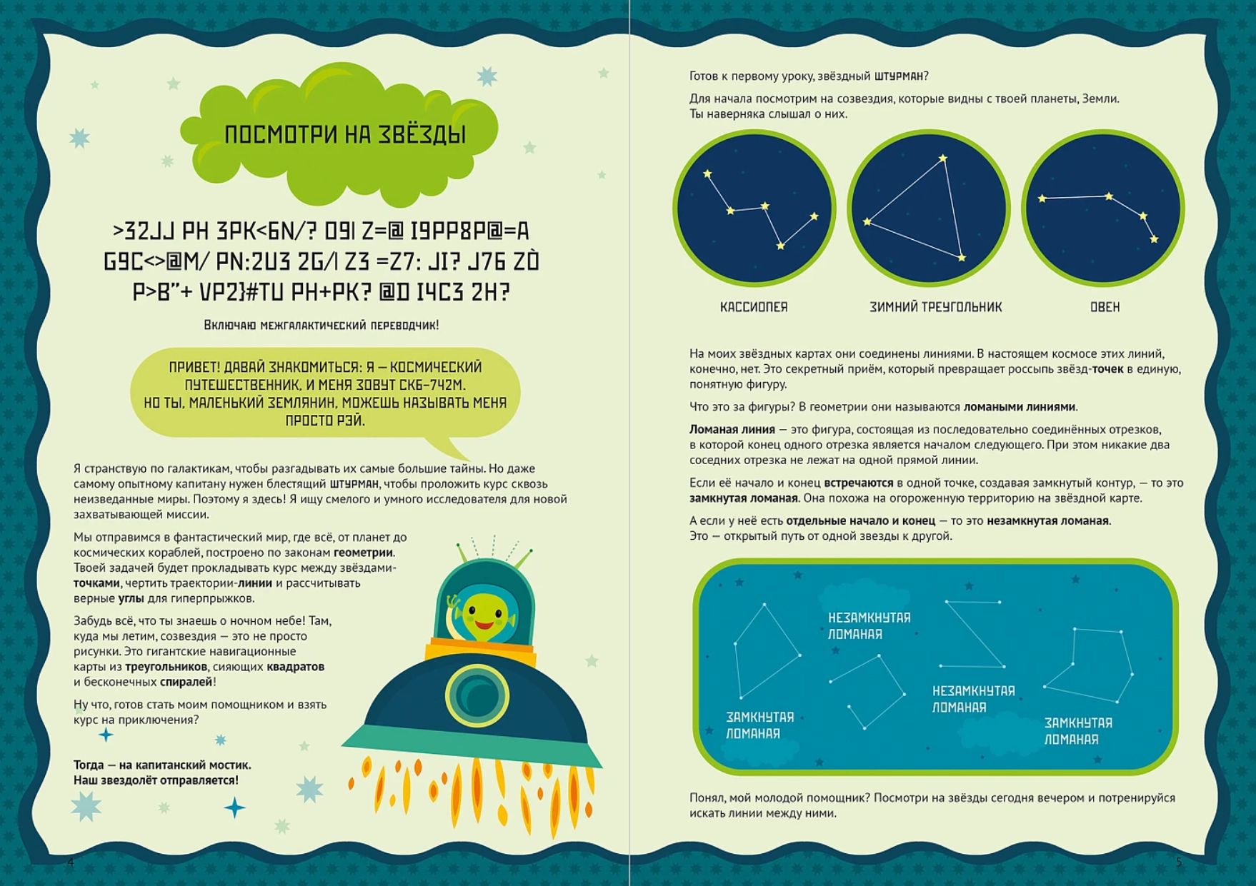 Каждая глава — это миссия на новой планете: нужно прокладывать курс между звёздами-точками, исследовать планету Многоугольников, строить объёмные планеты-кристаллы из развёрток, расшифровывать послания из квадранта Дельта-Гамма и даже чинить гигантский механизм из шестерёнок.