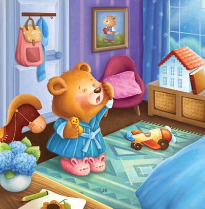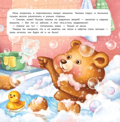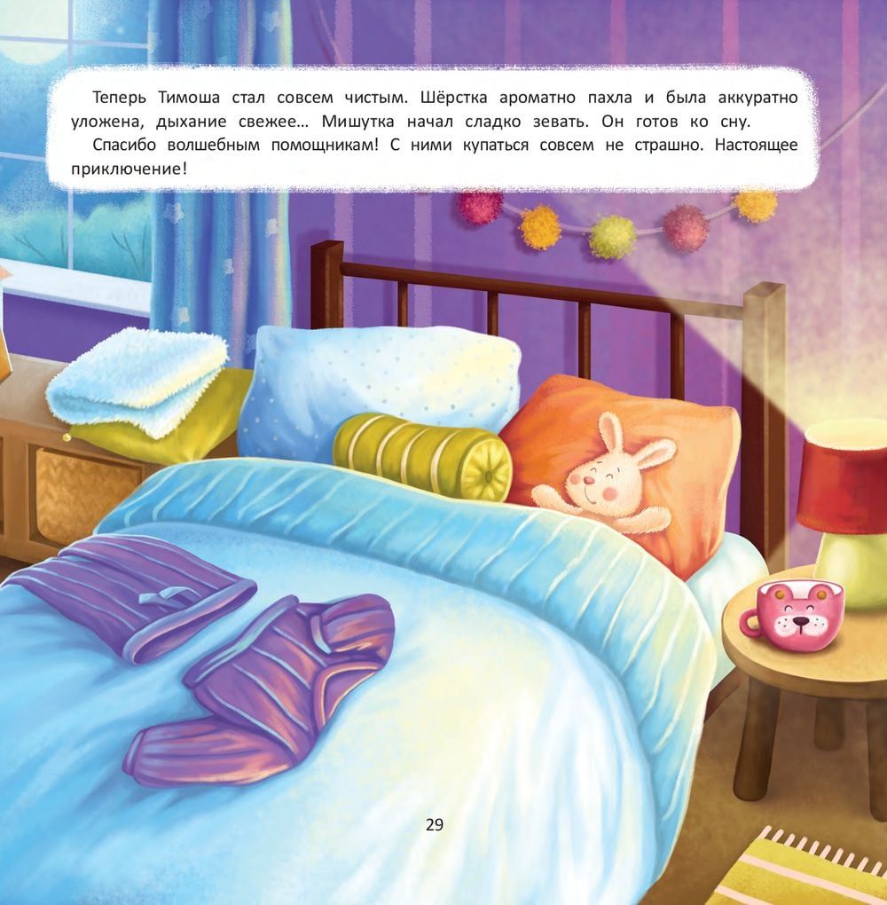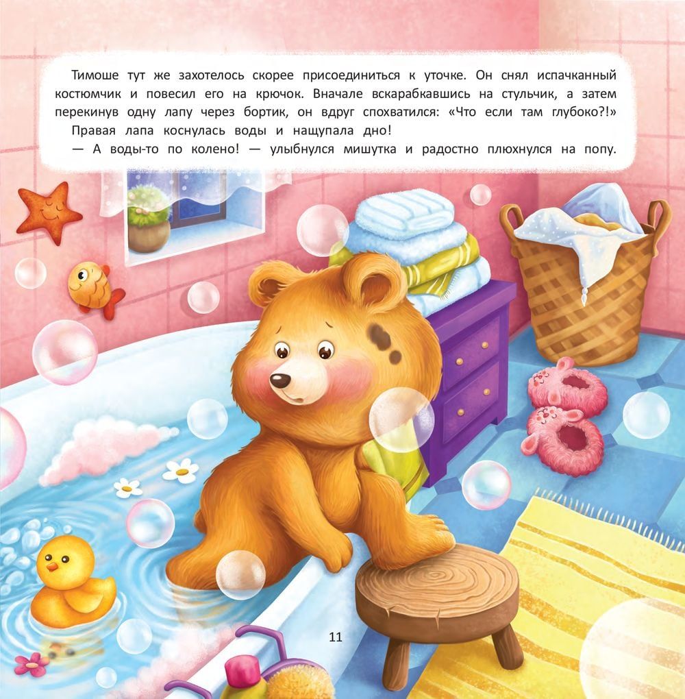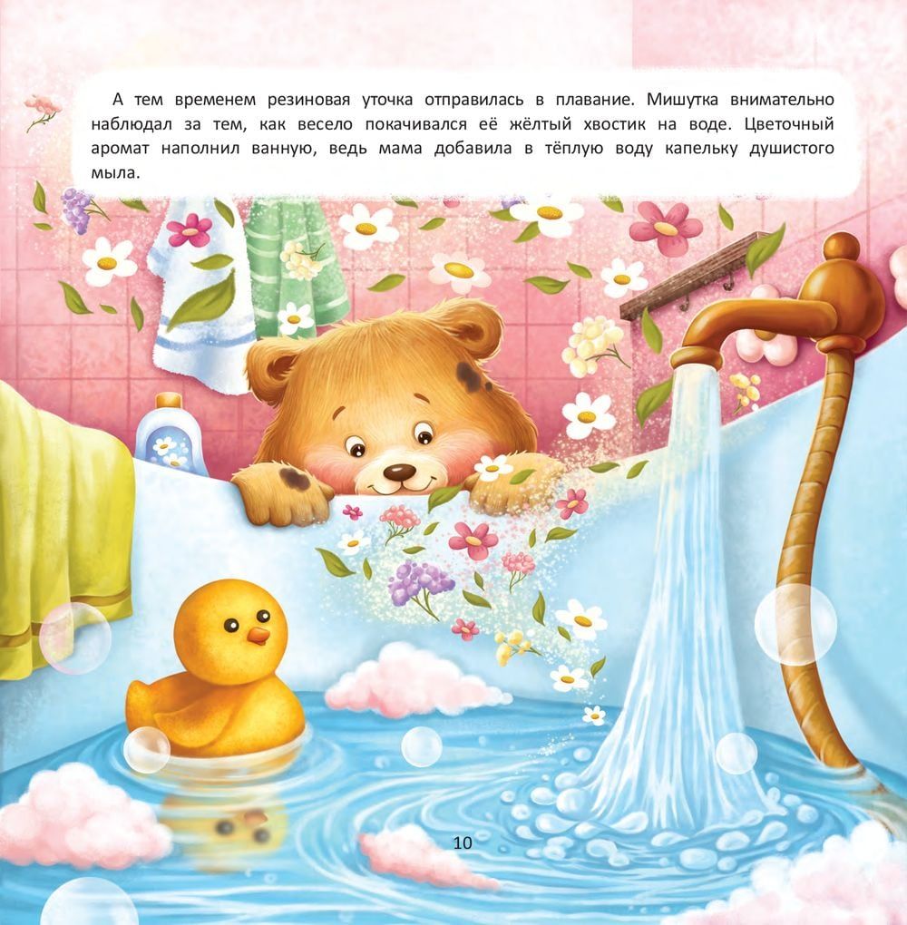 Целый день мишутка играл в лесу и сильно испачкался! Пришла пора купаться. Но вот беда: малыш капризничает! Мама говорит ему, что не нужно волноваться, ведь купание можно превратить в увлекательное приключение! Ванную комнату наполняет цветочный аромат душистого мыла, весело булькает вода, а жёлтая резиновая уточка приветливо покачивается на волнах. Мишутка знакомится с волшебными помощниками: душистым мылом, шампунем, который не щиплет глазки, пушистым полотенцем, гребешком, зубной щёткой и пастой со вкусом ежевики. Малыш весело плещется в ванной, его шёрстка становится чистой, и наступает время надевать пижамку и отправляться в кроватку. Мягкая подушка и тёплое одеяло ласково обнимают мишутку. Впереди его ждёт новое приключение  -  сладкий  сон!