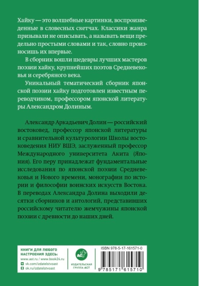 Уникальный тематический сборник японской поэзии хайку подготовлен известным российским исследователем и переводчиком, профессором японской литературы НИУ ВШЭ и заслуженным профессором Международного университета Акита Александром Долиным, который много лет жил и работал в Стране восходящего солнца.