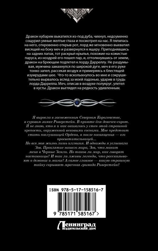 Я выросла в заснеженном Северном Королевстве, в суровом замке Риверстейн. В приюте для девочек-сирот. Я не знаю, кто я и как оказалась у стен этой страшной крепости, окруженной вековыми соснами. Мне предстоит стать послушницей Ордена, а после посвящения — его просветительницей...Но вся моя жизнь лишь иллюзия. И однажды я услышала Зов. Проклятие нашего мира, Зов, что манит меня в Черные Земли. Но таков ли мир, как говорят наставницы? И так ли лживы легенды, что рассказывают о демонах и магах? А самое главное — какую страшную тайну скрывает мрачная громада Риверстейн?