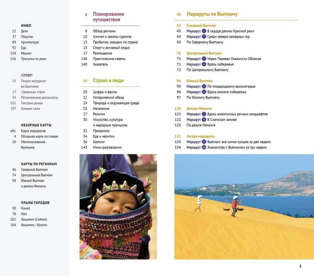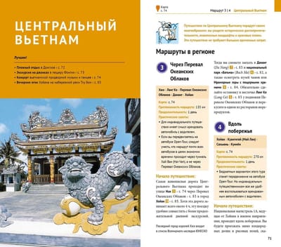 В путеводителе «Вьетнам» вы найдете разделы, которые помогут подготовиться к путешествию. Это краткая история государства, расположенного на двух континентах, информация о транспортном сообщении, календарь предстоящих событий и праздников. Раздел климат поможет выбрать лучшее время для путешествия и отдыха, а сведения о курортах, гостиницах и ресторанах - сориентироваться во всем многообразии предложений, а также уникальные маршруты по стране. Для удобства все они разделены по разделам: Северный, Центральный и Южный Вьетнам. В отдельные главы выделены маршруты по дельте Меконга и экстра-маршруты, которые позволят грамотно спланировать пребывание в стране в течение двух или трех недель.