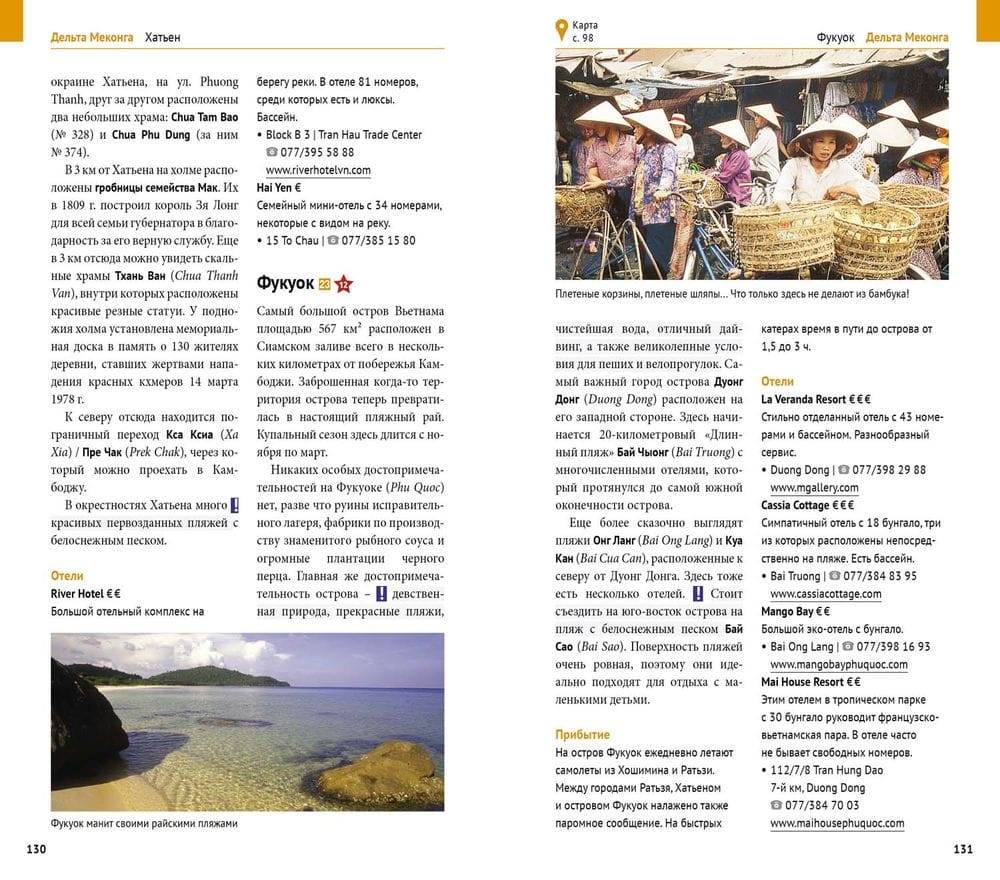 Путеводитель «Вьетнам» не только знакомит с лучшими курортными зонами (остров Фукуок, Муйне), спа-отелями, где отдых превращается в поистине райское наслаждение, но и помогает спланировать путешествие по самым интересным городам полуострова Индокитай. Загляните в Ханой, где в узких переулках Старого города сохранилась неповторимая атмосфера колониального города, полюбуйтесь великолепными пейзажами бухты Халонг и горными ландшафтами в Сале. Любители истории по достоинству оценят коллекцию музея чамов в Дананге и здания XVI в., сохранившиеся в городе Хойан.