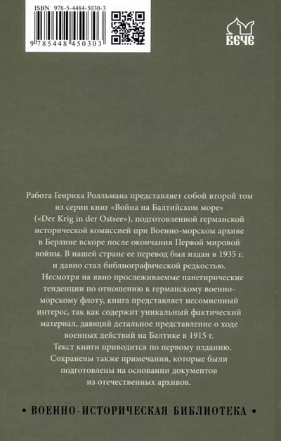Работа Генриха Ролльмана представляет собой второй том из серии книг «Война на Балтийском море» («Der Krig in der Ostsee»), подготовленной германской исторической комиссией при Военно-морском архиве в Берлине вскоре после окончания Первой мировой войны. В нашей стране ее перевод был издан в 1935 г. и давно стал библиографической редкостью.Несмотря на явно прослеживаемые панегирические тенденции по отношению к германскому военно-морскому флоту, книга представляет несомненный интерес, так как содержит уникальный фактический материал, дающий детальное представление о ходе военных действий на Балтике в 1915 г.Текст книги приводится по первому изданию. Сохранены также примечания, которые были подготовлены на основании документов из отечественных архивов.