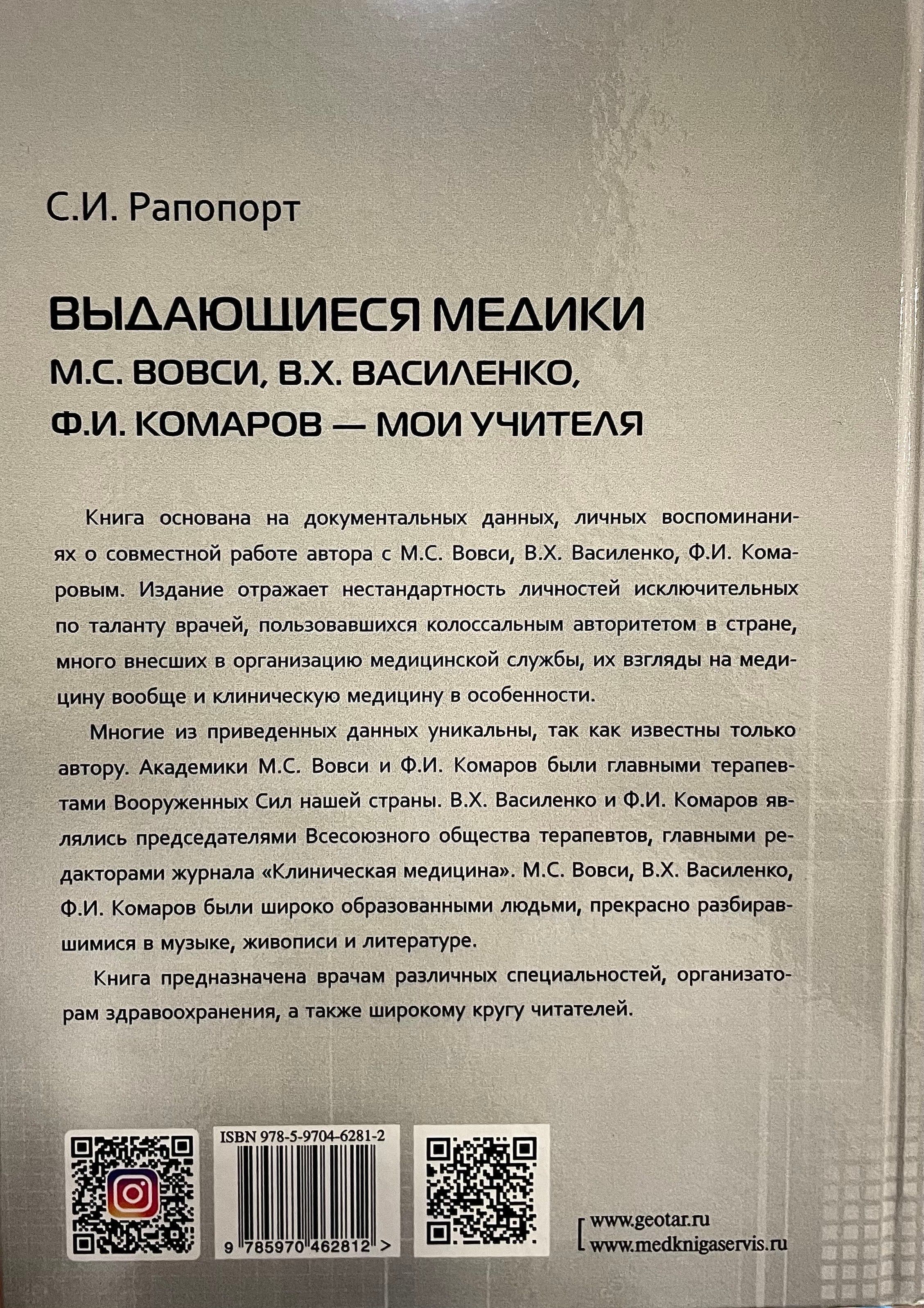 Академики М. С. Вовси и Ф. И. Комаров были главными терапевтами Вооруженных Сил Росии. В. Х. Василенко и Ф. И. Комаров являлись председателями Всесоюзного общества терапевтов, главными редакторами журнала «Клиническая медицина». М. С. Вовси, В. Х. Василенко, Ф. И. Комаров были широко образованными людьми, прекрасно разбиравшимися в музыке, живописи и литературе. Книга предназначена врачам различных специальностей, организаторам здравоохранения, а также широкому кругу читателей.