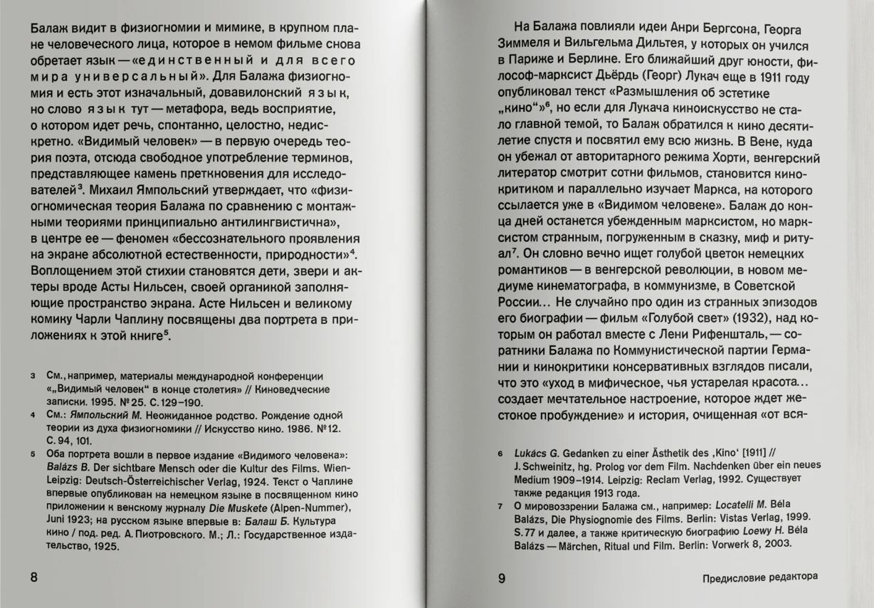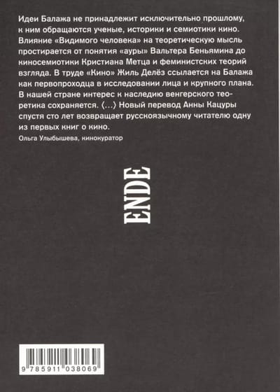 «Видимый человек» (1924) венгерского литератора и поэта Белы Балажа (1884–1949) — одна из первых книг по кинотеории. Полагая, что «кинематограф делает видимым человека и его мир», Балаж — под влиянием идей Анри Бергсона, Георга Зиммеля и Вильгельма Дильтея, у которых он учился в Париже и Берлине, — обращается к физиогномии и мимике, становясь первопроходцем в исследовании лица и крупного плана. Он вступает в полемику с Кулешовым и Эйзенштейном, чтобы выявить эстетические закономерности киноискусства, описывает и анализирует его формы выразительности, выявляет принципы, сделавшие кинематограф таким популярным. Балаж рассматривает разные типы фильмов, раскрывает секреты оптических трюков, оценивает новое направление — цветное кино, — выявляет значение звука и музыки для фильмов, иронизирует над «хэппи-эндом». Идеи Балажа не принадлежит исключительно прошлому, к ним постоянно обращаются ученые, историки и семиотики кино. Влияние «Видимого человека» на теоретическую мысль простирается от понятия «ауры» Вальтера Беньямина до киносемиотики Кристиана Метца и феминистских теорий взгляда.
