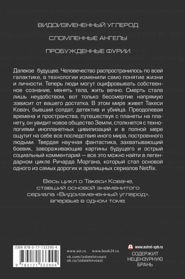 Далекое будущее. Человечество распространилось по всей галактике, а технологии изменили само понятие жизни и личности. Теперь люди могут оцифровывать собственное сознание, менять тела, жить вечно. Смерть стала лишь неудобством, вот только бессмертие напрямую зависит от вашего достатка. В этом мире живет Такеси Ковач, бывший солдат, детектив и убийца. Преодолевая времена и пространства, путешествуя с планеты на планету, он увидит новое общество Земли, столкнется с технологиями инопланетных цивилизаций и в полной мере ощутит на себе все последствия иного мира, построенного людьми. Твердая научная фантастика, захватывающий боевик, завораживающие картины будущего и острый социальный комментарий – все это можно найти в легендарном цикле Ричарда Моргана, который стал основой одного из самых дорогих и зрелищных сериалов Netflix.