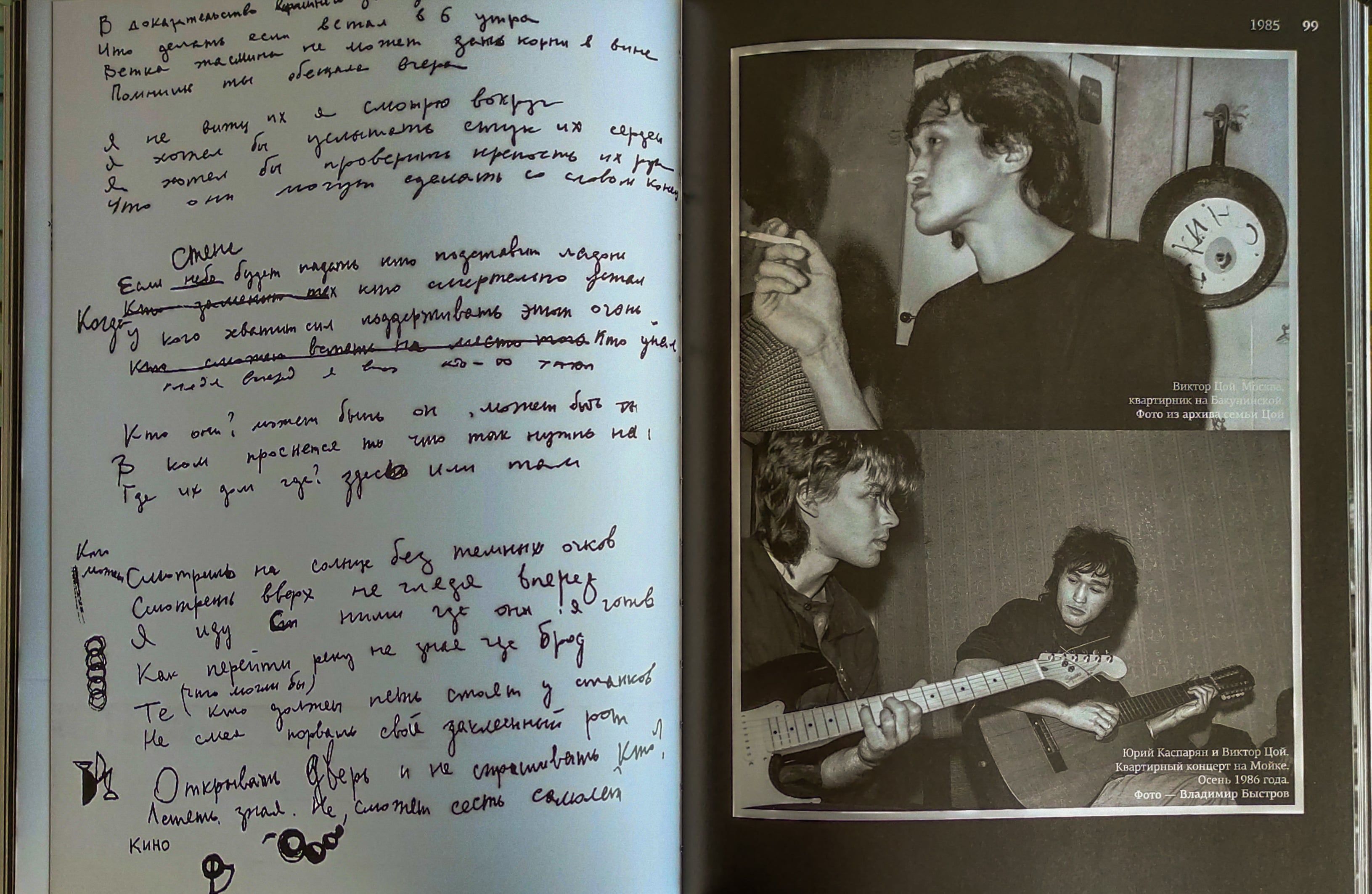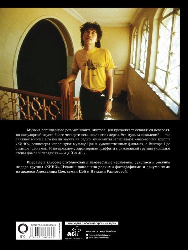 Впервые в альбоме опубликованы неизвестные черновики, рукописи и рисунки лидера группы "КИНО". Издание дополнено редкими фотографиями и документами из архивов Александра Цоя, семьи Цой и Наталии Разлоговой.