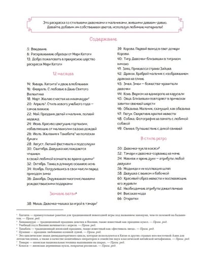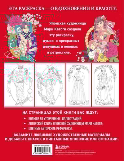 Откройте для себя прекрасный мир ретро-раскраски, созданный художницей Мари Катоги, вдохновленной японской культурой. Каждая иллюстрация отражает элегантность и атмосферу времен прошлых эпох. В этой раскраске вы встретите прекрасных героев и героинь на фоне различных событий и сезонов.