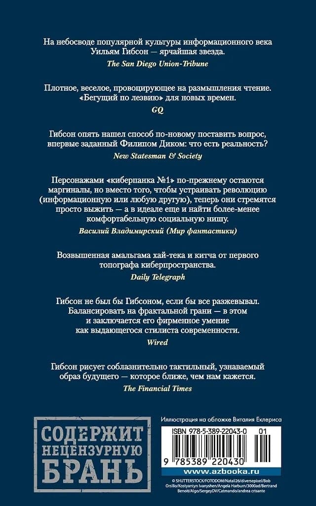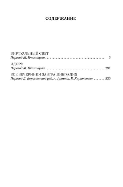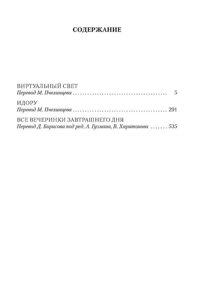 Уильям Гибсон прославился трилогией «Киберпространство» («Нейромант», «Граф Ноль», «Мона Лиза овердрайв»), ставшей краеугольным камнем киберпанка и определившей лицо современной литературы на десятилетия вперед. Но очень быстро жанровому революционеру стали тесны рамки любого жанра — и за совместной с Брюсом Стерлингом стимпанк-эпопеей «Машина различий» последовала «Трилогия Моста» («Виртуальный свет», «Идору», «Все вечеринки завтрашнего дня»), действие которой происходит в своего рода альтернативном настоящем, а фабула триллера, футуристический антураж и виртуозная скупость стилевых приемов порождают взрывоопасный, но неотвратимо притягательный коктейль. Здесь мощное землетрясение рассекло Калифорнию на Северную и Южную, и пресловутый Мост стал символом этого разделения. Здесь полицейский-неудачник Райделл и велосипедистка-курьер Шеветта-Мари сведены волей случая и вместе пытаются выжить в охоте, устроенной на них владельцами сверхважной информации, хранящейся в солнцезащитных очках системы «виртуальный свет». Здесь Токио заново застроен нанотехнологическими небоскребами, успехом пользуется ночной клуб по мотивам Франца Кафки, а по фанатскому сообществу пронесся слух, что рок-звезда по имени Рез собирается жениться на виртуальной звезде, актрисе и певице Рэй Тоэй. Здесь лучший в мире убийца не оставляет следов во всемирной паутине, а тайный хозяин мира думает, что идет по его следу…