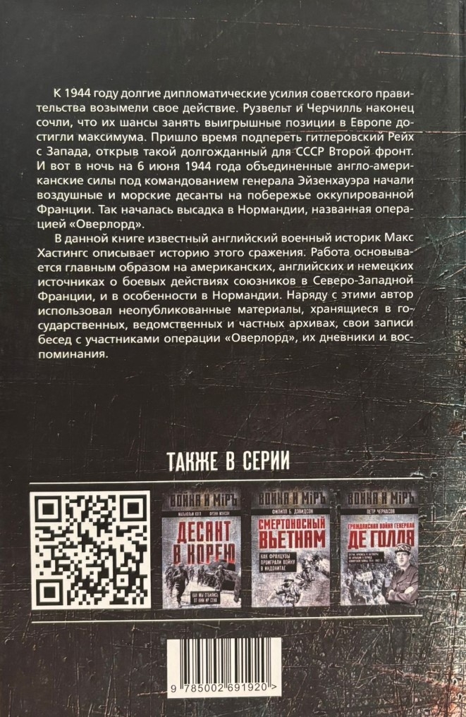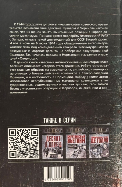 В данной книге известный английский военный историк Макс Хастингс описывает историю этого сражения. Работа основывается главным образом на американских, английских и немецких источниках о боевых действиях союзников в Северо-Западной Франции, и в особенности в Нормандии. Наряду с этими автор использовал неопубликованные материалы, хранящиеся в государственных, ведомственных и частных архивах, свои записи бесед с участниками операции «Оверлорд», их дневники и воспоминания.