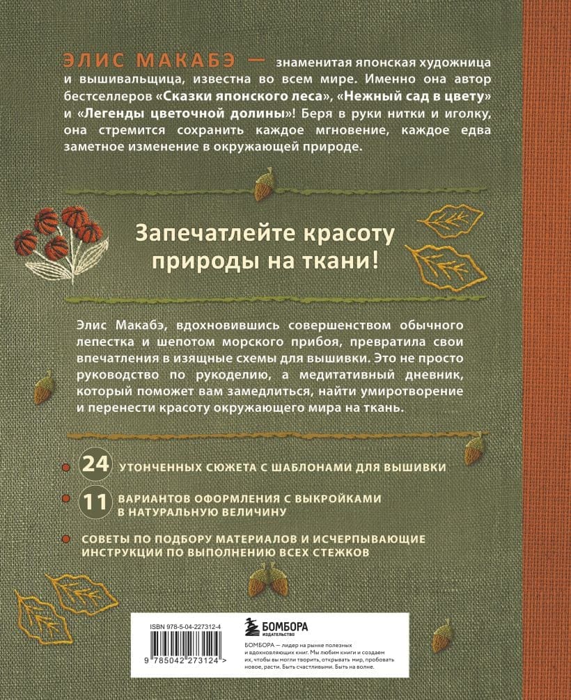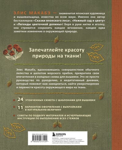 Элис Макабэ — знаменитая японская художница и вышивальщица, известна во всем мире. Именно она автор бестселлеров «Сказки японского леса», «Нежный сад в цвету» и «Легенды цветочной долины»! Каждый день, беря в руки нитки и иголку, она стремится запечатлеть каждое мгновение, каждое едва заметное изменение в окружающей природе.
