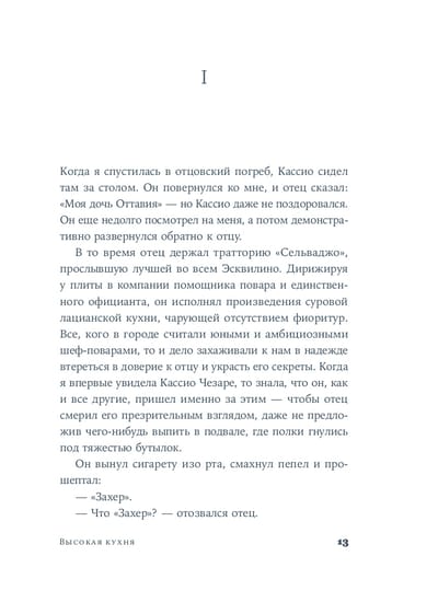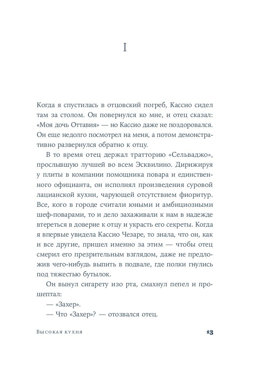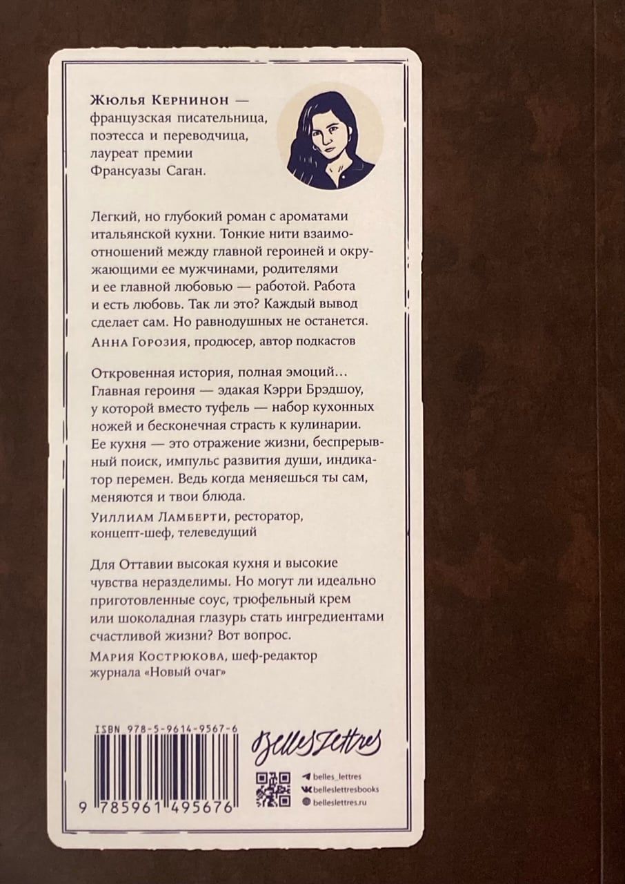 Жюлья Кернинон рассказывает историю сильной женщины в поисках себя. Ее роман — откровенный разговор об отношениях, семье, предназначении и, конечно, о магии высокой кухни, которая становится для героини и страстью, и смыслом, и спасением. Писательница погружает нас в атмосферу Италии, где еда — это искусство, а искусство — это сама жизнь. Блюда Оттавии, как и страницы ее жизни, полны надежд, нередко отчаяния, но неизменно — любви.