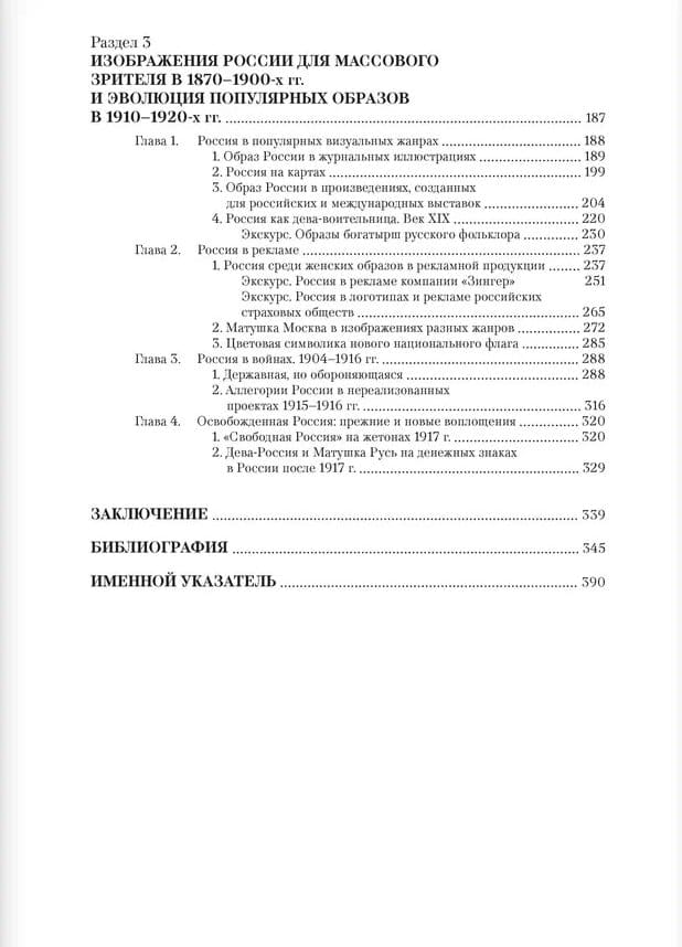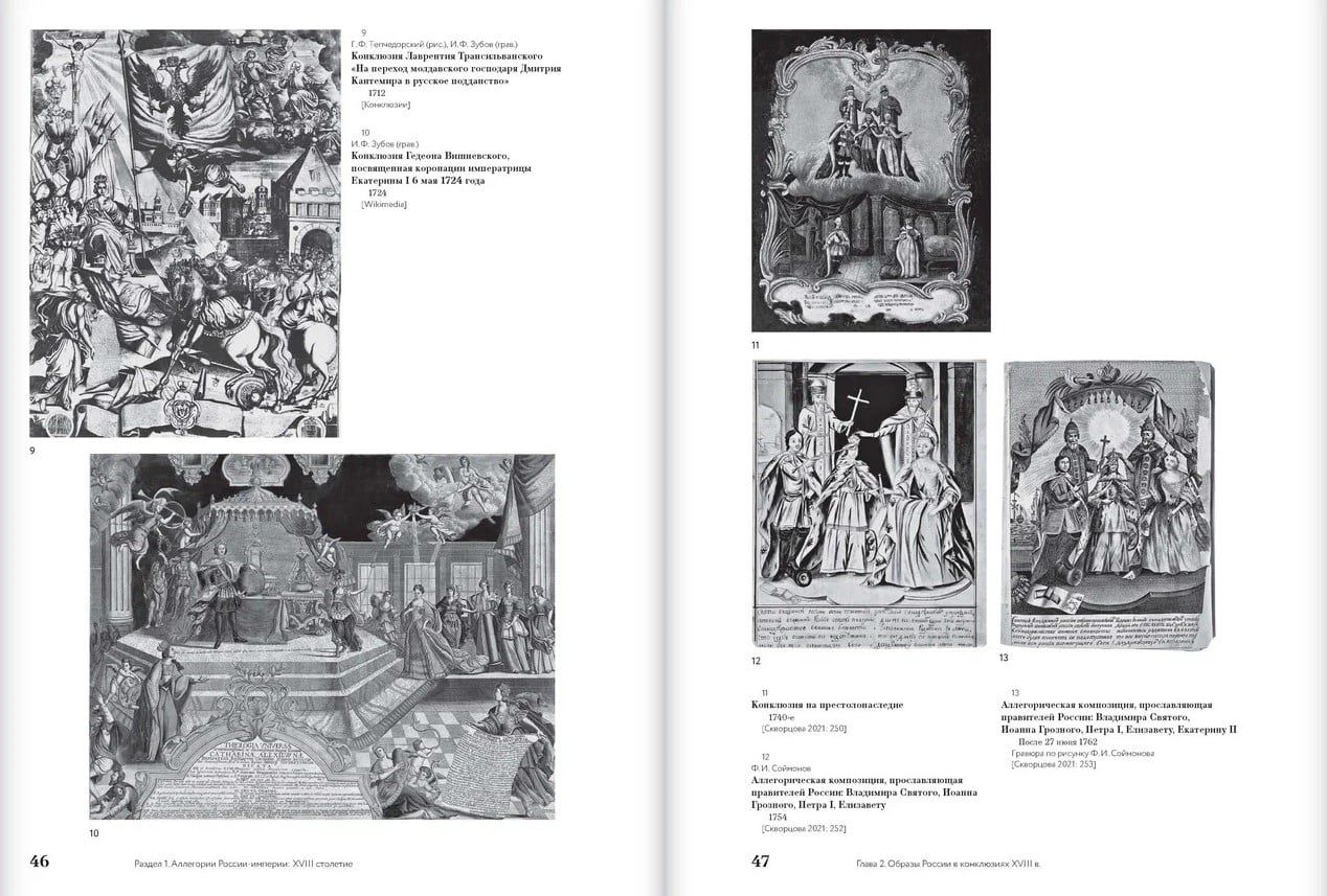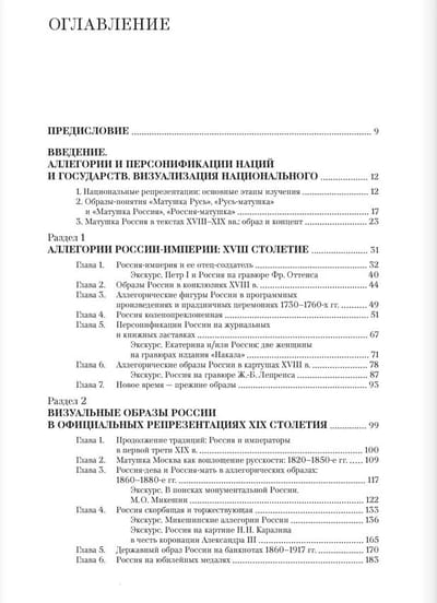 Книга является продолжением монографии «Визуальные репрезентации русскости в Российской империи второй половины XIX – начала XX в. Облики – обличья – облаченья» (М., 2024), посвященной истории представлений о русском своеобразии и национальном облике, а также проблемам конструирования русского национального костюма в период имперского нациестроительства. В центре данного исследования – процесс формирования антропоморфной персонификации России в феминной ипостаси на протяжении двух столетий (XVIII – начало XX в.). Эволюция образа России выявляется в комплексе изобразительных источников разных видов (гравюры, картуши, конклюзии, фейерверки, журнальные иллюстрации и карикатуры, проекты монументов, банкноты, коронационные аллегорические полотна, скульптуры, рисунки, медали, рекламы и афиши, открытки и пр.). Показаны тенденции складывания нескольких типов визуальных воплощений России (Россия-матушка, дева-воительница, державная Россия и др.), их трансформации в различных жанрах, а также проанализировано взаимодействие феминных репрезентаций России с антропоморфными изображениями Москвы-матушки в XIX в.