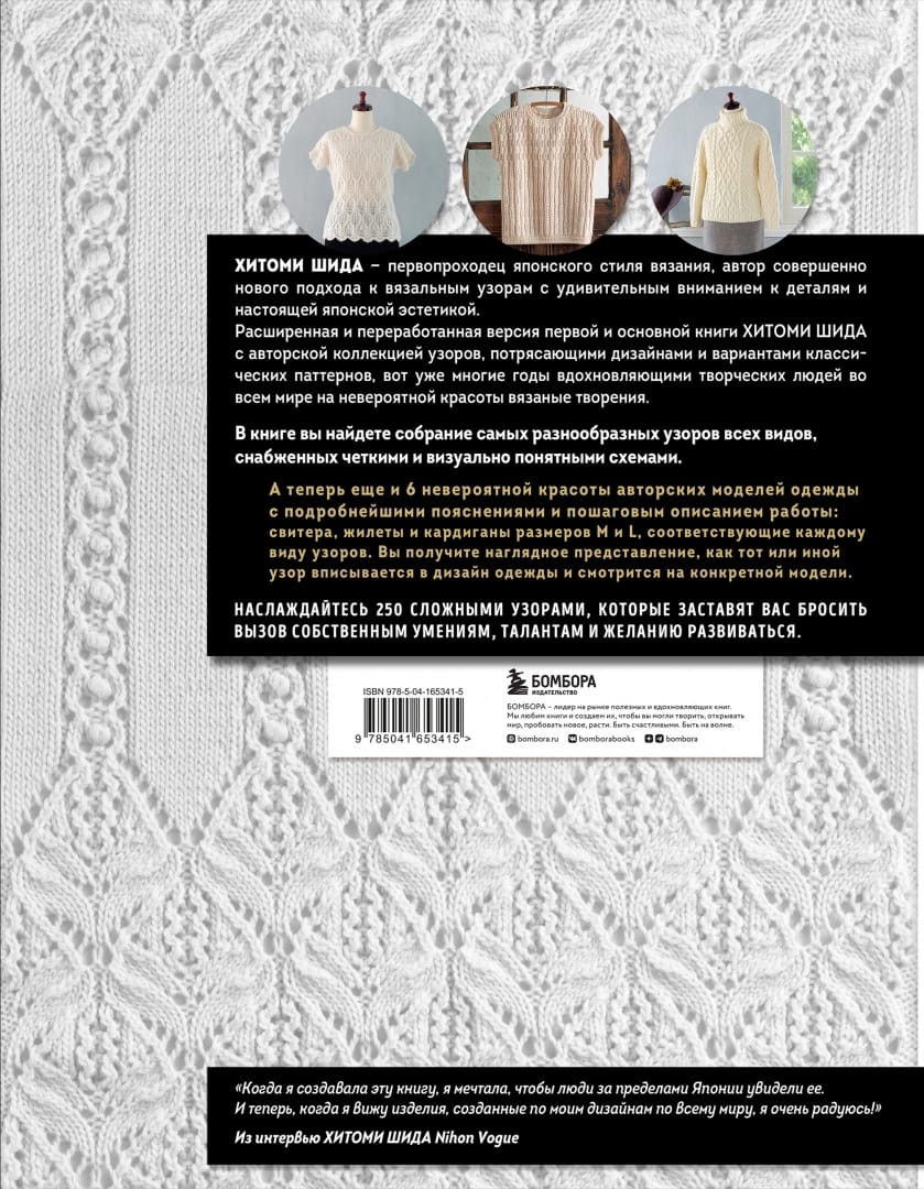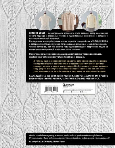 Расширенная и переработанная версия первой и основной книги первопроходца японского стиля вязания Хитоми Шиды с авторской коллекцией узоров, потрясающими дизайнами и вариантами классических паттернов, которые вот уже многие годы вдохновляюют творческих людей во всем мире на невероятной красоты вязаные творения. Все паттерны снабжены четкими и визуально понятными схемами. И самое главное: автор тщательно подобрала и добавила к коллеции 6 невероятной красоты моделей одежды с подробнейшими пояснениями и пошаговым описанием работы: свитера, жилеты и кардиганы размеров M и L, соответствующие каждому виду узоров. Вы получите наглядное представление, как тот или иной узор вписывается в дизайн одежды и смотрится на конкретной модели. Наслаждайтесь 250 сложными узорами, которые заставят вас бросить вызов собственным умениям, талантам и желанию развиваться.