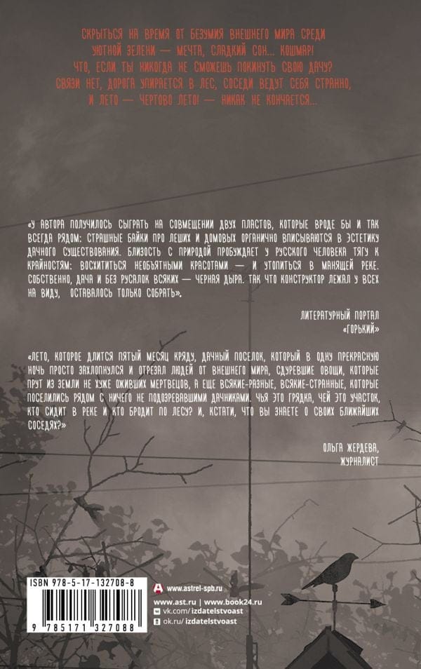 Что, если ты НИКОГДА не сможешь покинуть свою дачу? Связи нет, дорога упирается в лес, соседи ведут себя странно, и лето — чертово лето! — никак не кончается... Роман вошел в лонг-лист премий "Большая книга", "Ясная Поляна", "Интерпресскон" и получил премии "Новые горизонты" и "Мастера ужасов".