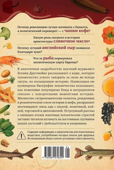 Научный журналист Ксения Друговейко увлекательно рассказывает о том, как появление самых популярных блюд, продуктов и ингредиентов связано с поворотными моментами человеческой истории. Автор в живой манере и с отличным чувством юмора предлагает читателю взглянуть на биографию человечества через историю еды. Неочевидная связь кулинарии с наукой, политикой, войной, торговлей и дипломатией заставляет посмотреть на привычные рецепты и постоянных спутников наших застолий с любопытством и уважением.
