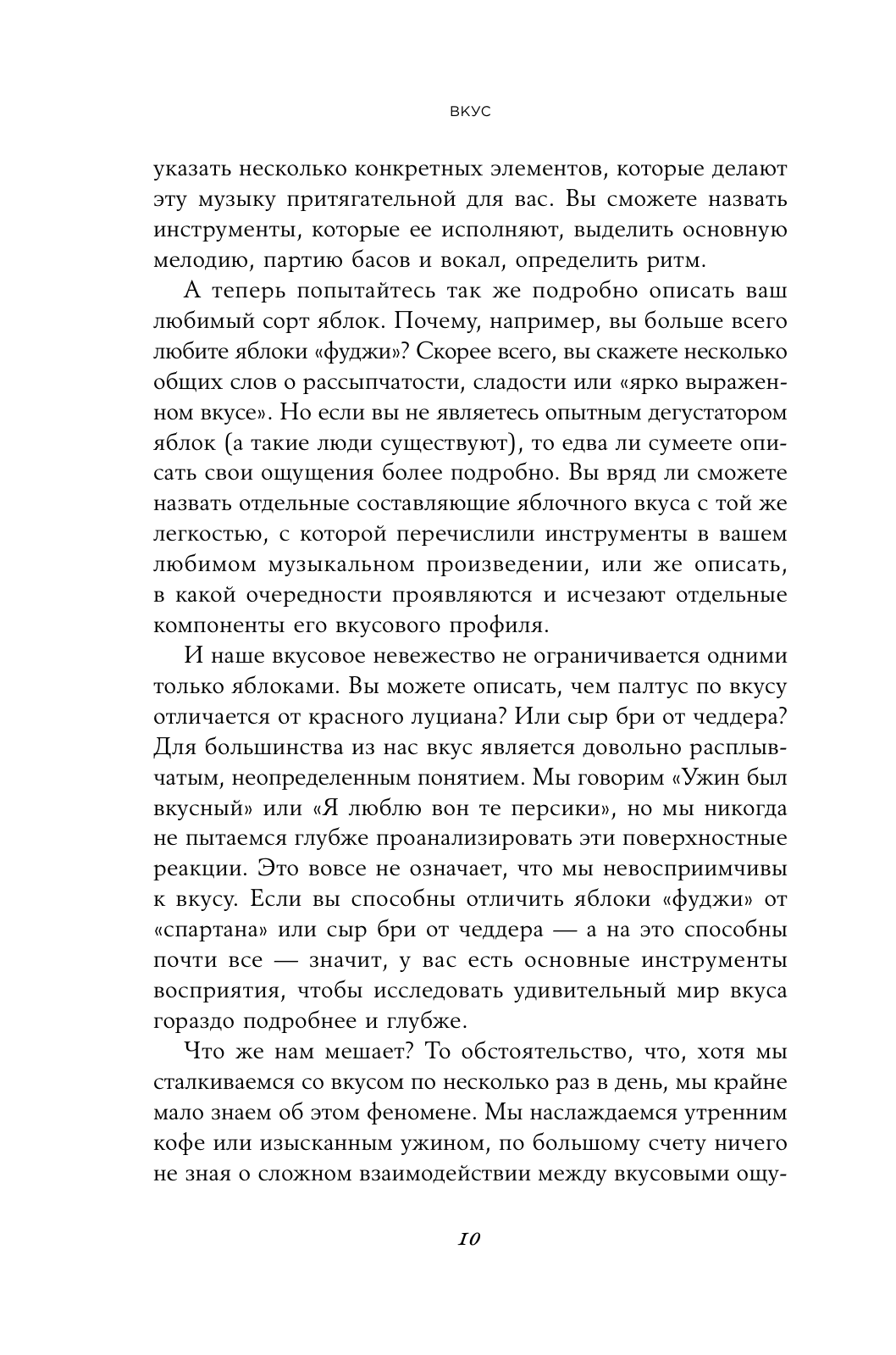 Мы наслаждаемся изысканной едой, но ничего не знаем о том, как взаимодействуют наши вкусовые рецепторы и обоняние, осязание, зрение и даже наши ожидания. А ведь именно эти сложные взаимосвязи и создают то, что мы называем «вкус». Перед вами своего рода путеводитель по миру вкуса, от нейробилогии до науки производства продуктов питания. Книга поможет вам гораздо лучше понимать, что такое вкус и как использовать эти знания для обогащения своего вкусового опыта. Вы узнаете, как мы воспринимаем вкус, как он создается и как его усилить. Предупреждаем: после прочтения книги все вкусное может стать еще вкуснее.