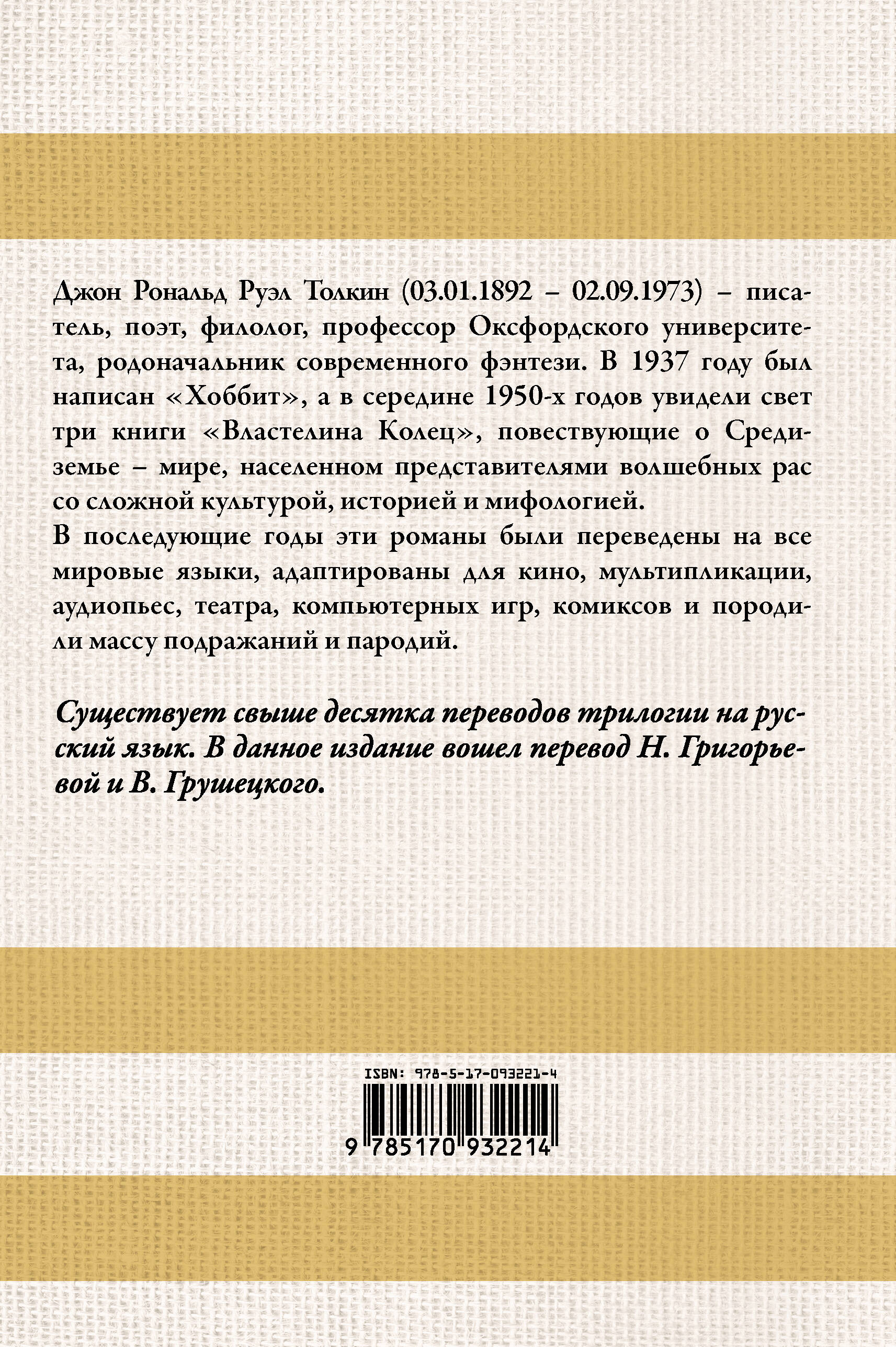Джон Рональд Руэл Толкин (3.01.1892 – 2.09.1973) – писатель, поэт, филолог, профессор Оксфордского университета, родоначальник современной фэнтези. В 1937 году был написан «Хоббит», а в середине 1950-х годов увидели свет три книги «Властелина колец», повествующие о Средиземье – мире, населенном представителями волшебных рас со сложной культурой, историей и мифологией.