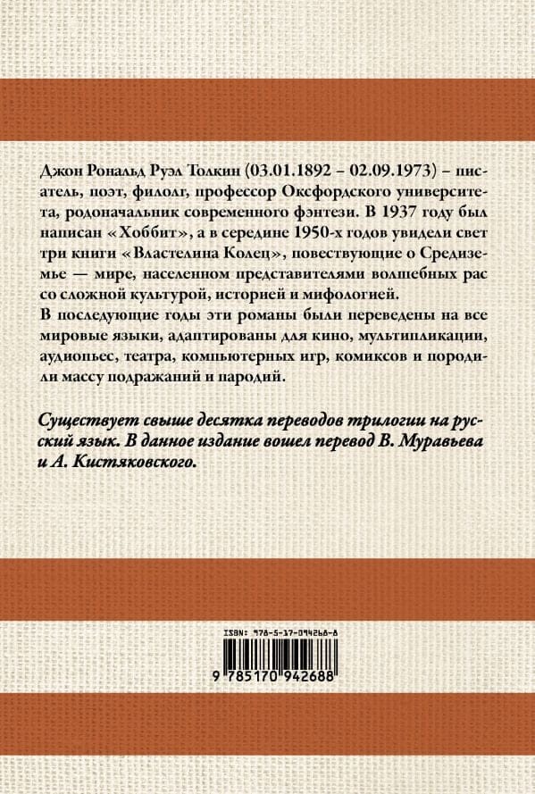 Джон Рональд Руэл Толкин (3.01.1892 – 2.09.1973) – писатель, поэт, филолог, профессор Оксфордского университета, родоначальник современной фэнтези. В 1937 году был написан «Хоббит», а в середине 1950-х годов увидели свет три книги «Властелина колец», повествующие о Средиземье – мире, населенном представителями волшебных рас со сложной культурой, историей и мифологией. В последующие годы эти романы были переведены на все мировые языки, адаптированы для кино, мультипликации, аудиопьес, театра ,компьютерных игр, комиксов и породили массу подражаний и пародий. Существует свыше десятка переводов трилогии на русский язык. В данное издание вошел перевод В. Муравьева и А. Кистяковского.