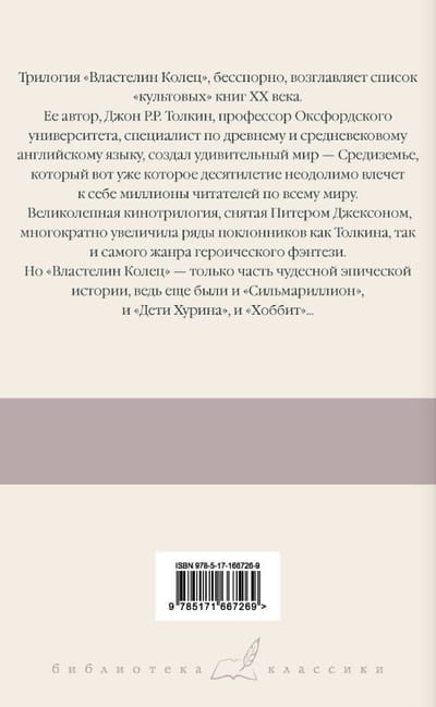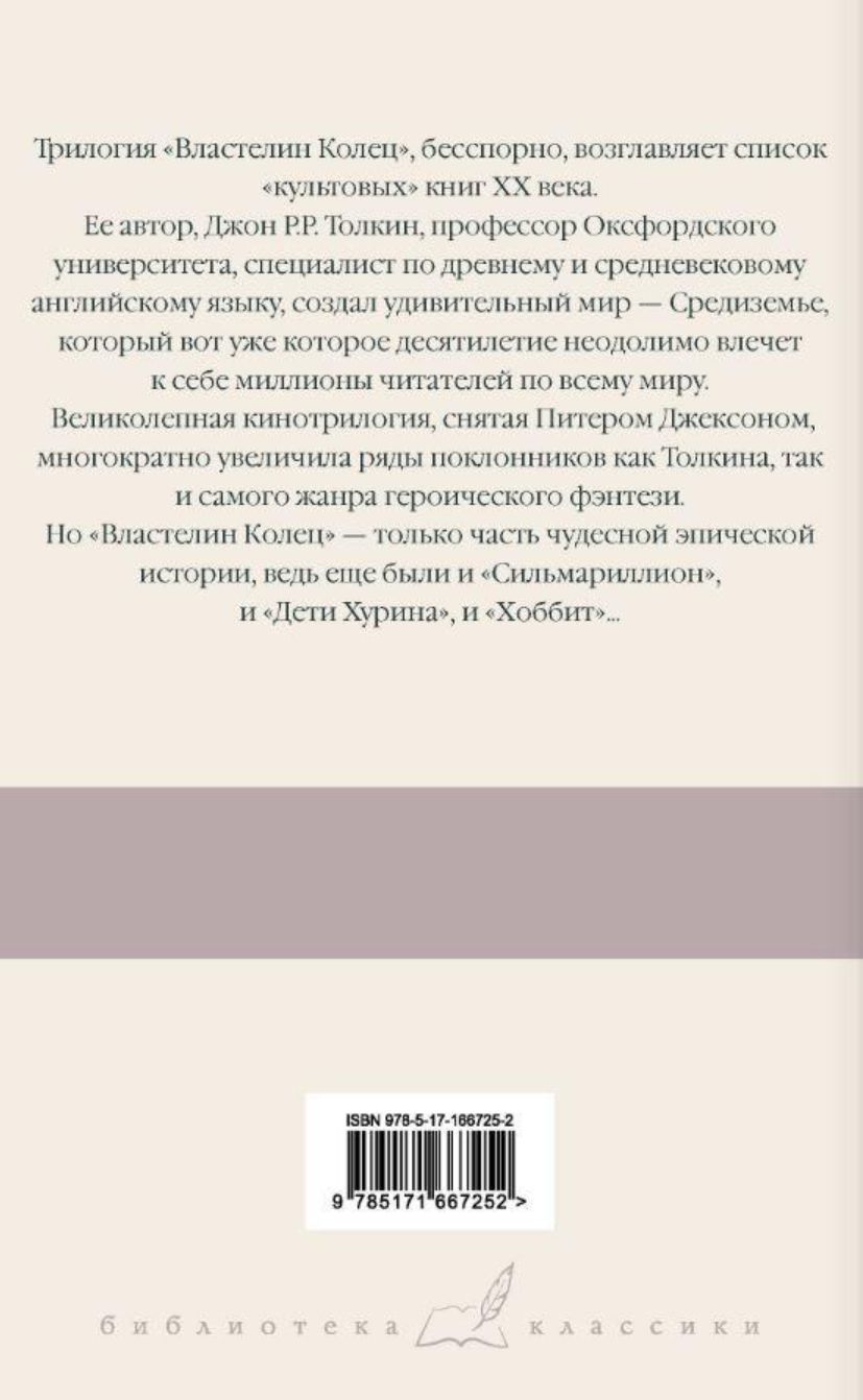 В это издание вошла трилогия Джона Р.Р.Толкина «Властелин Колец» в переводе В. Каррика и М. Каменкович. Перевод сопровождается комментариями, которые позволяют читателям глубже погрузиться в сказочный мир, и узнать больше о летописях королей и властителей Средьземелья, нуменорских календарях, языках и народах, и многом другом.