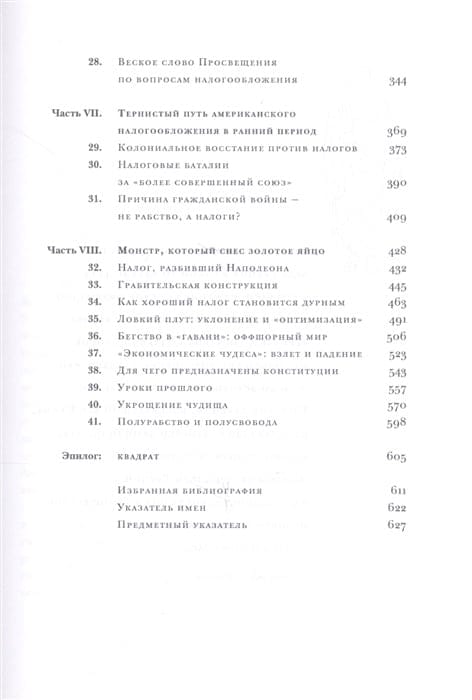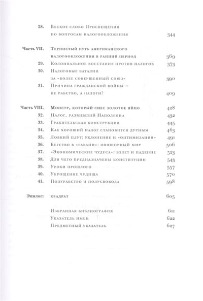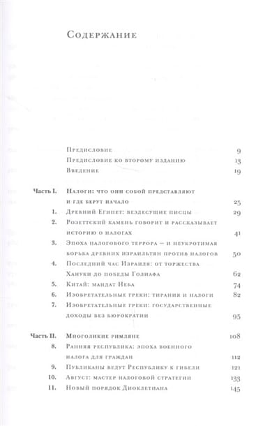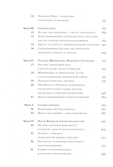 Написанию этой книги автор посвятил более 20 лет, выясняя, каким образом налоги повлияли на ход истории. В книге рассматриваются ключевые эпизоды налоговой политики в различные эпохи и в самых разных странах. Начиная с Древнего Египта вплоть до наших дней автор препарирует методы и обоснования, используемые правителями и правительствами для обирания своих подданных. С налогами связаны появление и исчезновение государств и империй; в связи с налогообложением появились прообразы нынешних парламентов. Автор выражает сожаление по поводу уровня современных дискуссий о налогообложении, из которых совершенно исчезли темы, аргументы и вообще знание, наработанное великими мыслителями эпохи Просвещения, которые обсуждали налогообложение в связи с деспотизмом и процветанием, их интересовало благо всей страны, а не «бюджетная эффективность» и интересы отдельных отраслей и групп населения.