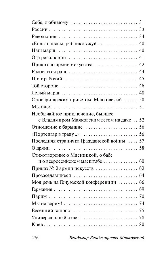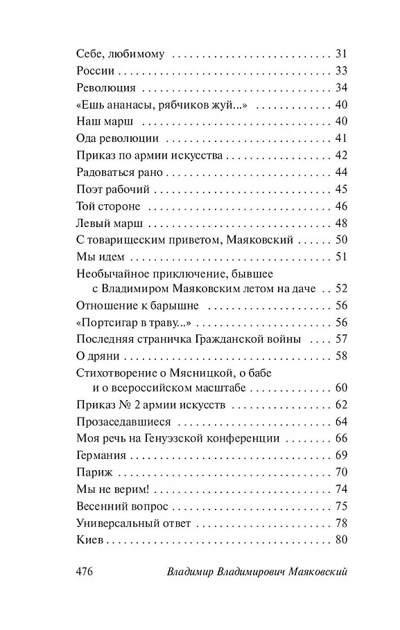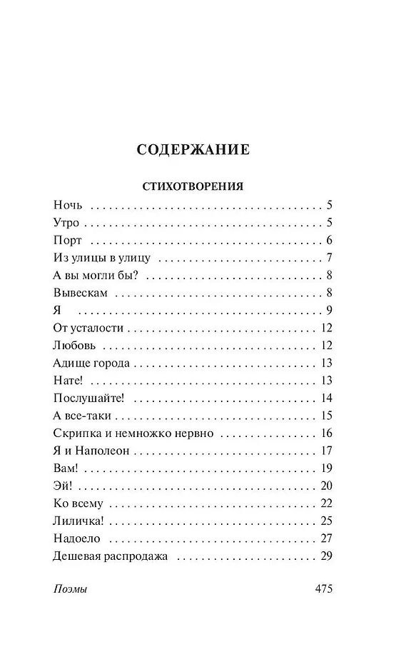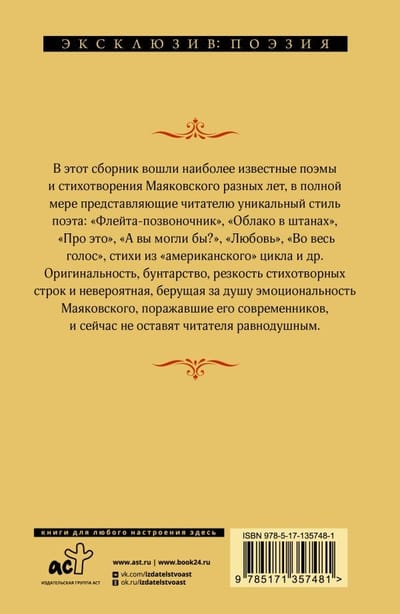 В этот сборник вошли наиболее известные поэмы и стихотворения Маяковского разных лет, в полной мере представляющие читателю уникальный стиль поэта: «Флейта‑позвоночник», «Облако в штанах», «Про это», «А вы могли бы?», «Любовь», «Во весь голос», стихи из «американского» цикла и др. Оригинальность, бунтарство, резкость стихотворных строк и невероятная, берущая за душу эмоциональность Маяковского, поражавшие его современников, и сейчас не оставят читателя равнодушным.