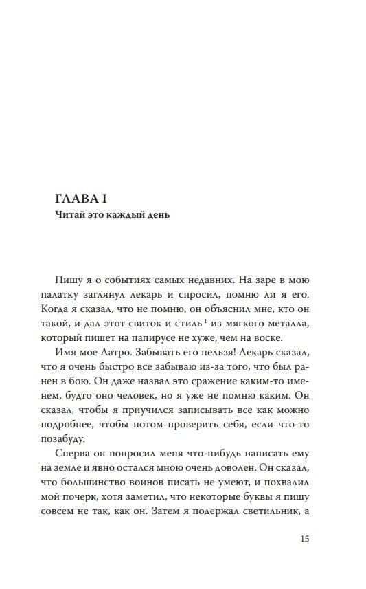 Каждое утро воин Латро просыпается, не помня вчерашнего дня и даже собственного имени. Единственная нить, связывающая его с прошлым,— собственный дневник на свитке папируса.
