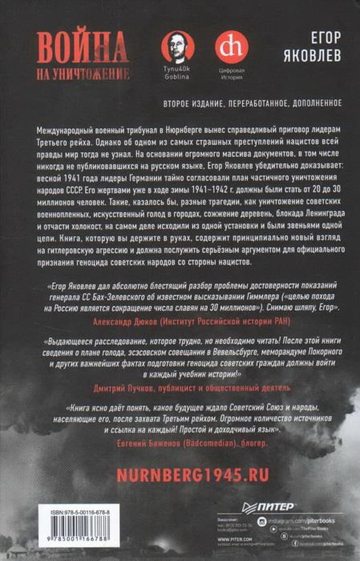 Международный военный трибунал в Нюрнберге вынес справедливый приговор лидерам Третьего рейха. Однако об одном из самых страшных преступлений нацистов всей правды мир тогда не узнал. На основании огромного массива документов, в том числе никогда не публиковавшихся на русском языке, Егор Яковлев убедительно доказывает: весной 1941 года лидеры Германии тайно согласовали план частичного уничтожения народов СССР. Его жертвами уже в ходе зимы 1941-1942 г. должны были стать от 20 до 30 миллионов человек. Такие, казалось бы, разные трагедии, как уничтожение советских военнопленных, искусственный голод в городах, сожжение деревень, блокада Ленинграда и отчасти холокост, на самом деле исходили из одной установки и были звеньями одной цепи. Книга, которую вы держите в руках, содержит принципиально новый взгляд на гитлеровскую агрессию и должна послужить серьёзным аргументом для официального признания геноцида советских народов со стороны нацистов. Для второго издания автор существенно переработал текст и вдвое увеличил его в объёме. 2-е издание, переработанное и дополненное.