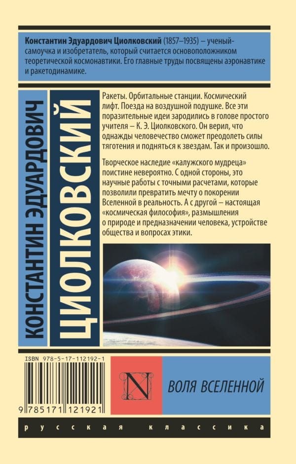 Ракеты. Орбитальные станции. Космический лифт. Поезда на воздушной подушке. Все эти поразительные идеи зародились в голове простого школьного учителя - К.Э. Циолковского. Он верил, что однажды человечество сможет преодолеть силы тяготения и подняться к звездам. Так и произошло. Творческое наследие «калужского мудреца» поистине невероятно. С одной стороны, это научные работы с точными расчетами, которые позволили превратить мечту о покорении Вселенной в реальность. А с другой - настоящая «космическая философия», размышления о природе и предназначении человека, устройстве общества и вопросах этики.