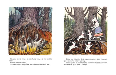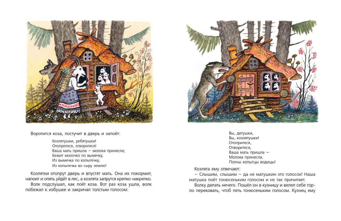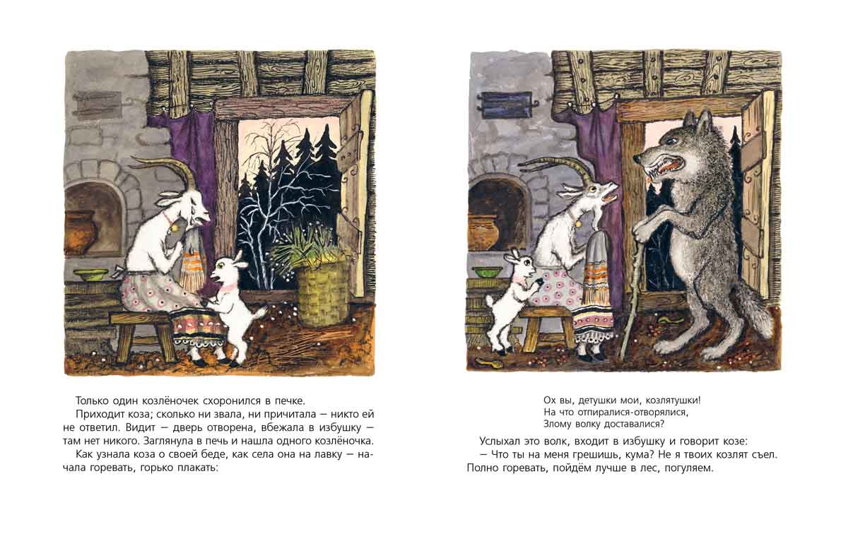Русская народная сказка про волка и козлят хранит в себе народную мудрость, понятную самым маленьким читателям. История, знакомая с детства каждому, представлена в обработке А. Толстого, а сопровождают текст неповторимые иллюстрации Юрия Васнецова, каждая книга которого — маленький художественный шедевр.