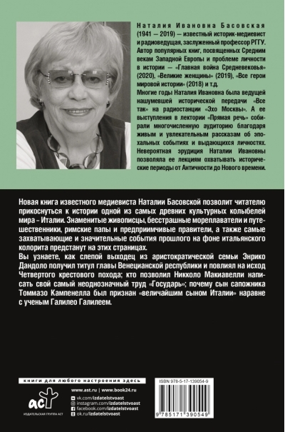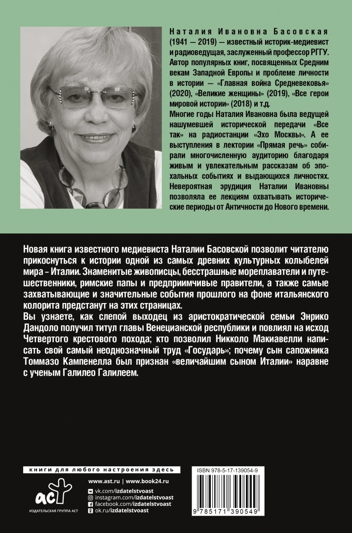 Новая книга известного медиевиста Наталии Басовской позволит читателю прикоснуться к истории одной из самых древних культурных колыбелей мира – Италии. Знаменитые живописцы, бесстрашные мореплаватели и путешественники, римские папы и предприимчивые правители, а также самые захватывающие и значительные события прошлого на фоне итальянского колорита предстанут на этих страницах. Вы узнаете, как слепой выходец из аристократической семьи Энрико Дандоло получил титул главы Венецианской республики и повлиял на исход Четвертого крестового похода; кто позволил Никколо Макиавелли написать свой самый неоднозначный труд «Государь»; почему сын сапожника Томмазо Кампанелла был признан «величайшим сыном Италии» наравне с ученым Галилео Галилеем.